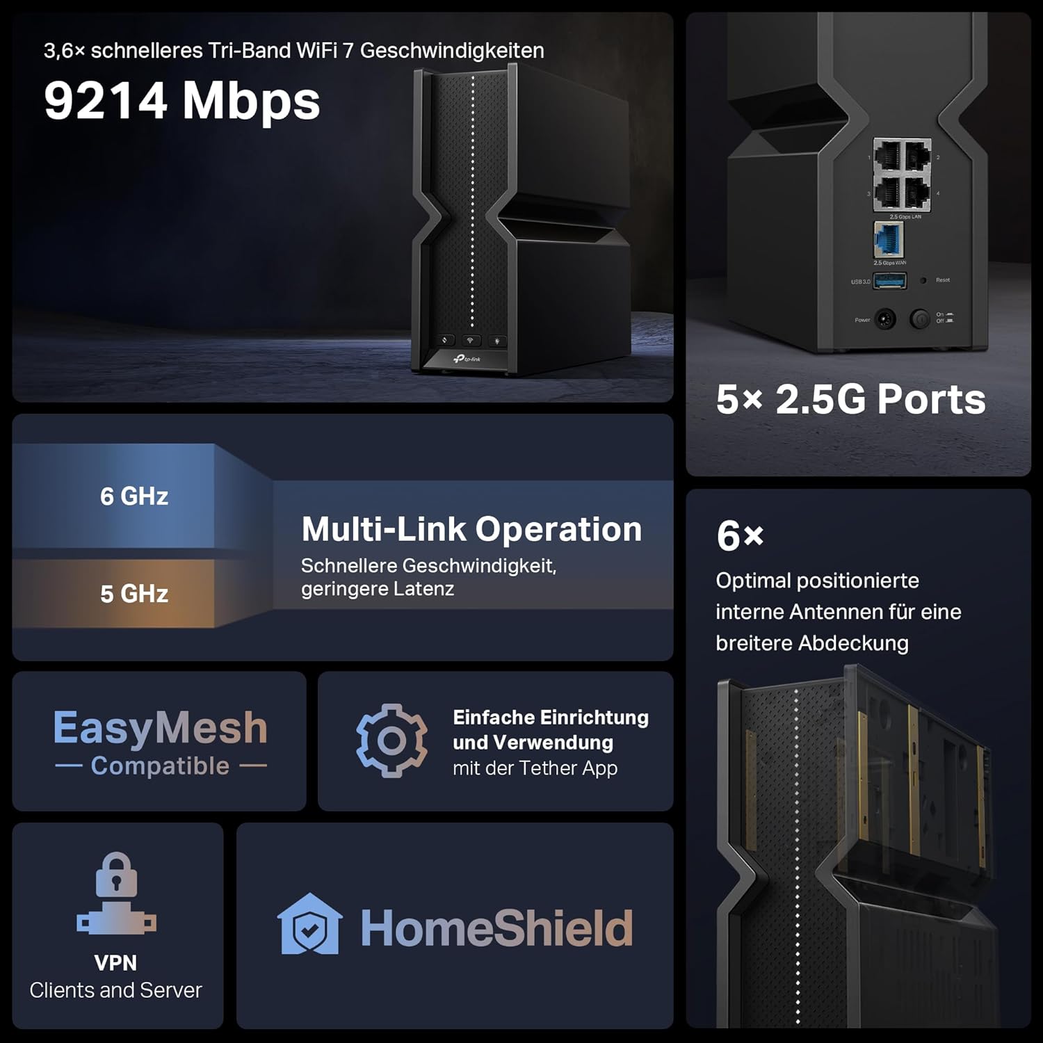 TP-Link Tri-Band BE9300 WiFi 7 рутер Archer BE550, 6-потоков 9.2 Gbps, 2.5G портове, USB 3.0, 6 интелигентни вътрешни антени, VPN клиенти и сървъри, HomeShield