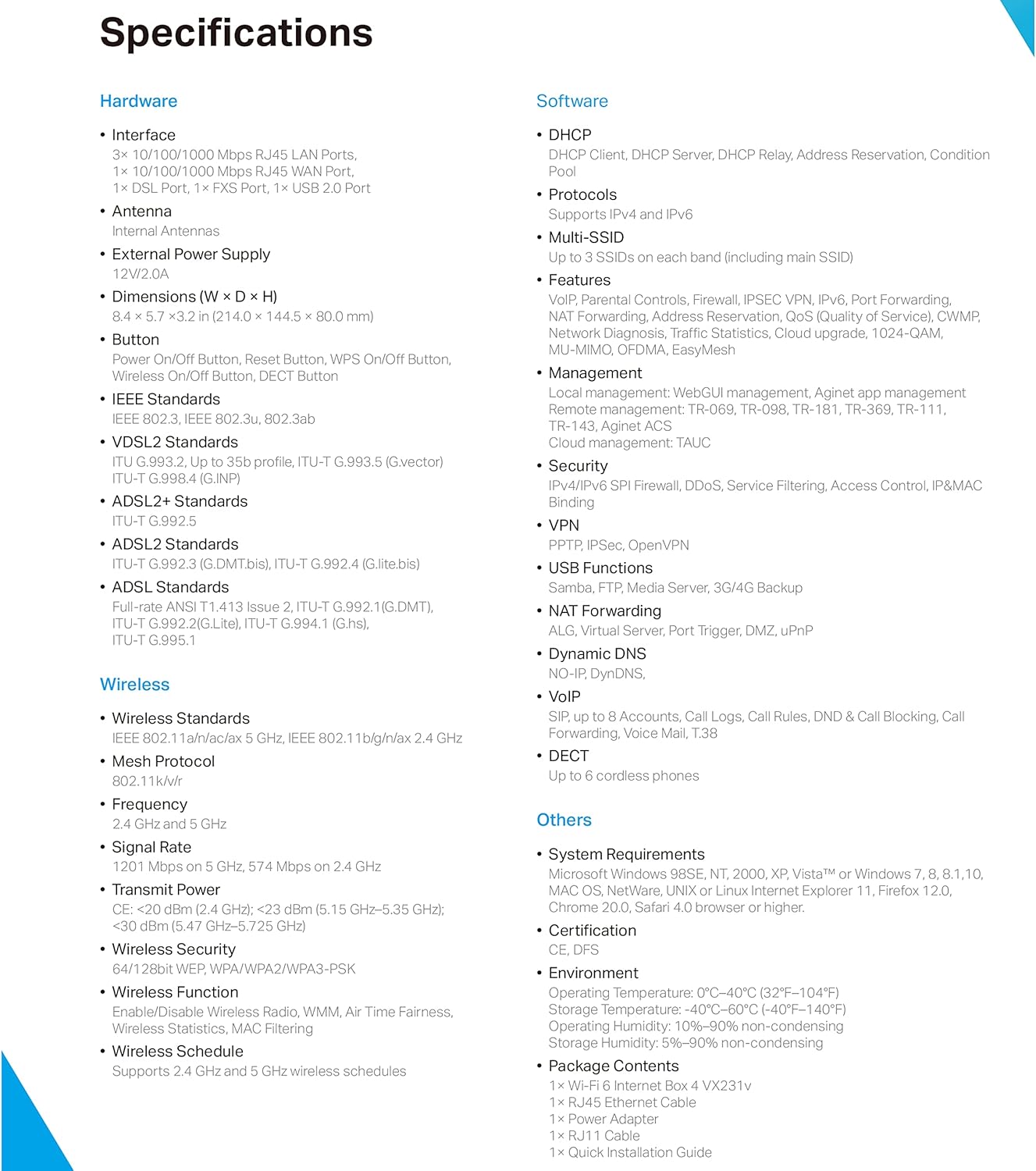 TP-Link VX231v Wi-Fi 6 VDSL модем рутер, VDSL2 35b 300 Mbit/s, 4 x Gigabit порта, AX1800 двубандов WLAN, поддържа Telekom, O2, 1&1, не е Vodafone MIC, само за Германия