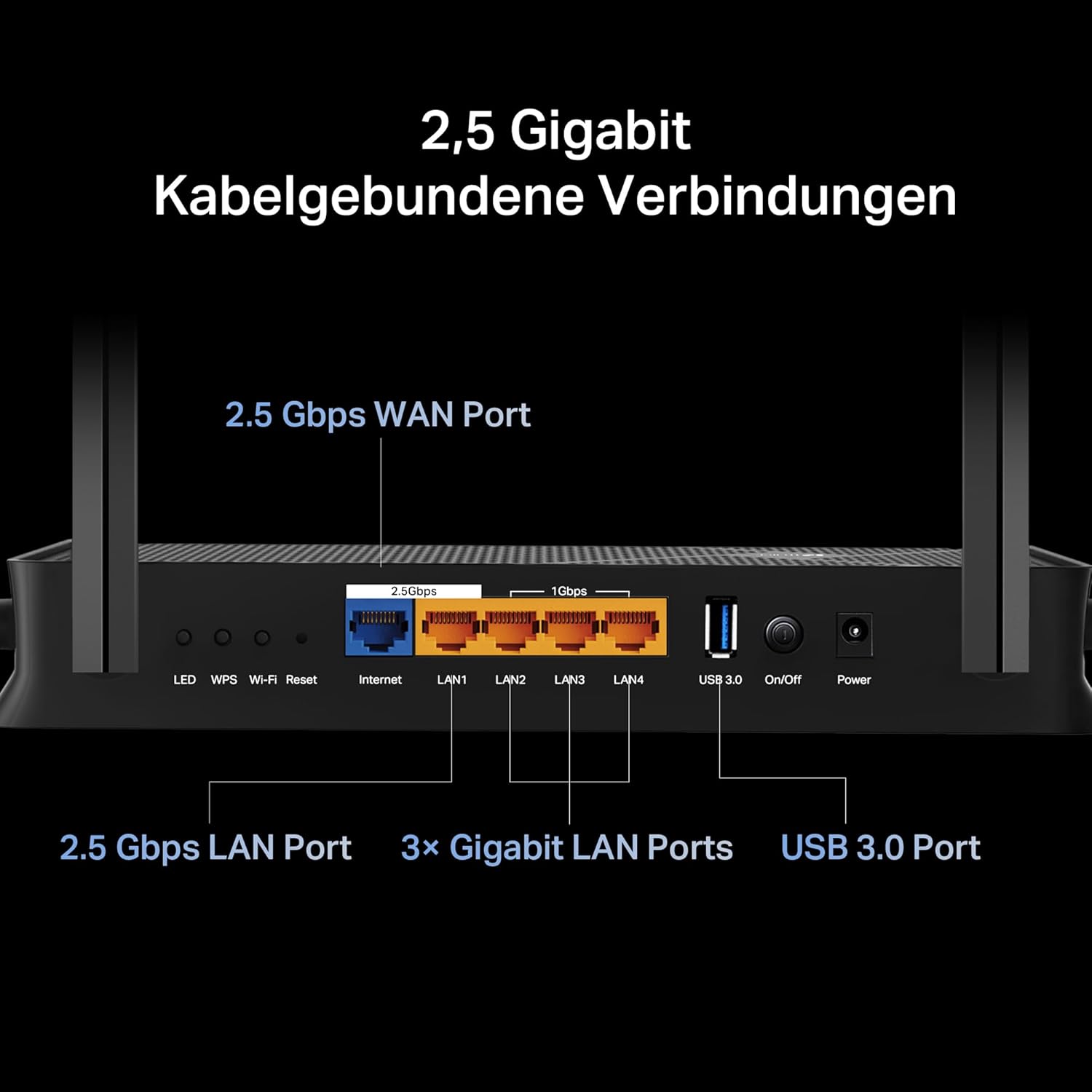 • 2.5G кабелна връзка: 1×2.5Gbps WAN порт, 1×2.5Gbps LAN порт и 3×1Gbps LAN порта осигуряват високоскоростен трансфер на данни.