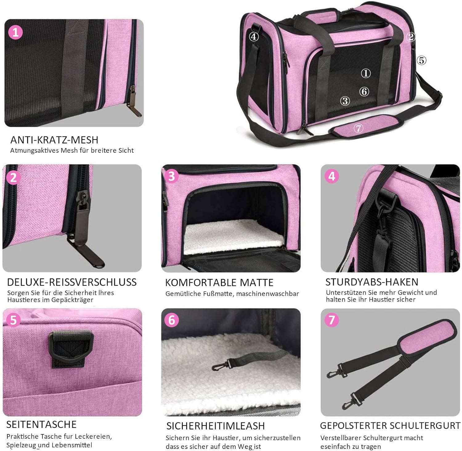 This pet carrier features two connecting loop handles, can be worn as a double strap or as a luggage compensation for safe transportation and features padded shoulder straps and handles.