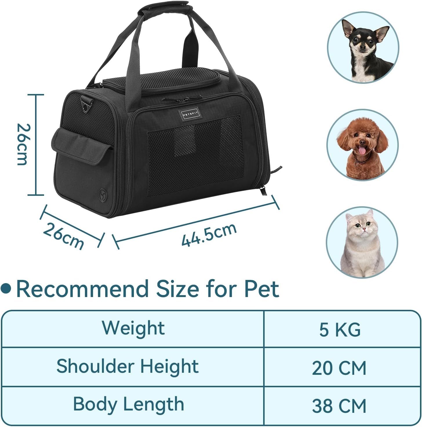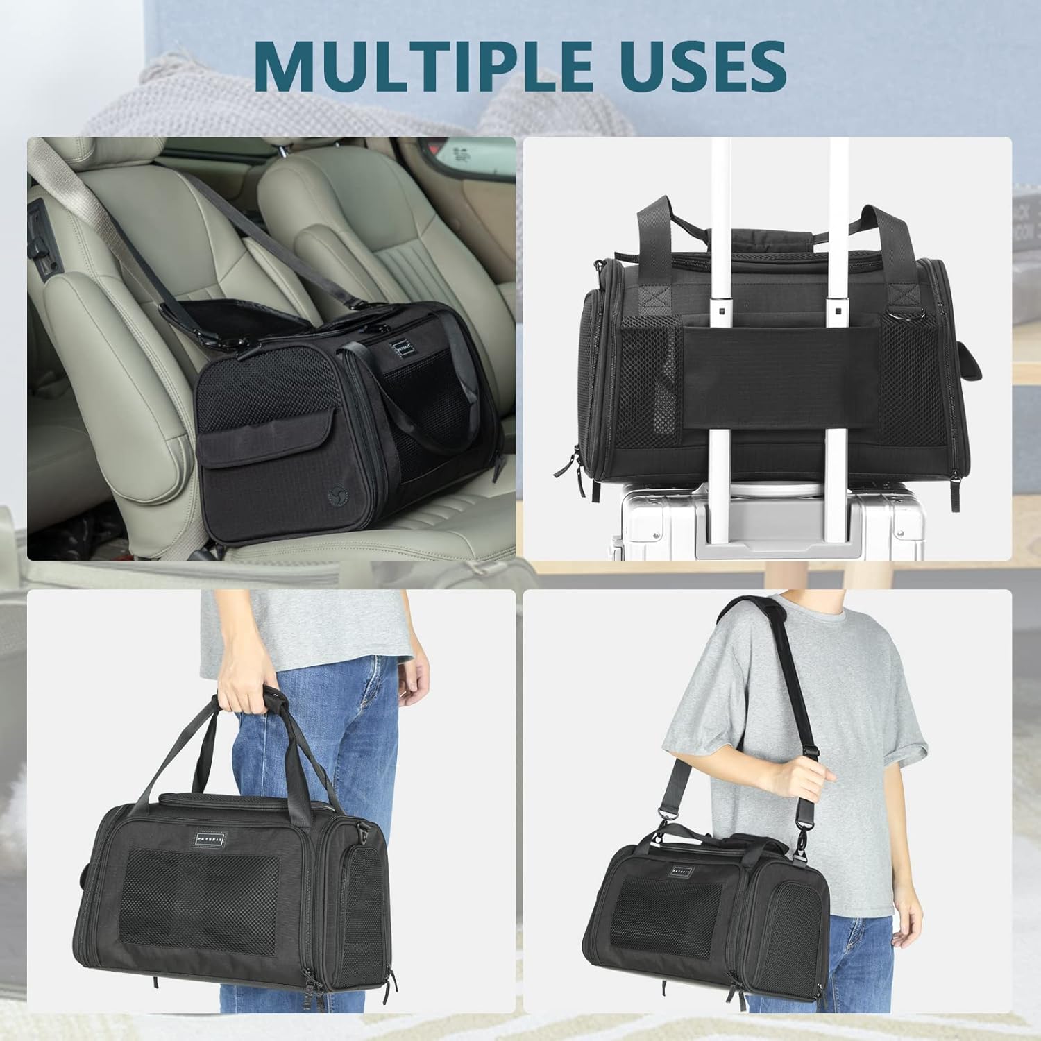 • Много начини за избор: тази чанта за пътуване за кучета и котки може да се носи в ръка или на рамо, може да се постави на столчето за кола или на куфара. (Размер L не е подходящ за чанта за самолет)