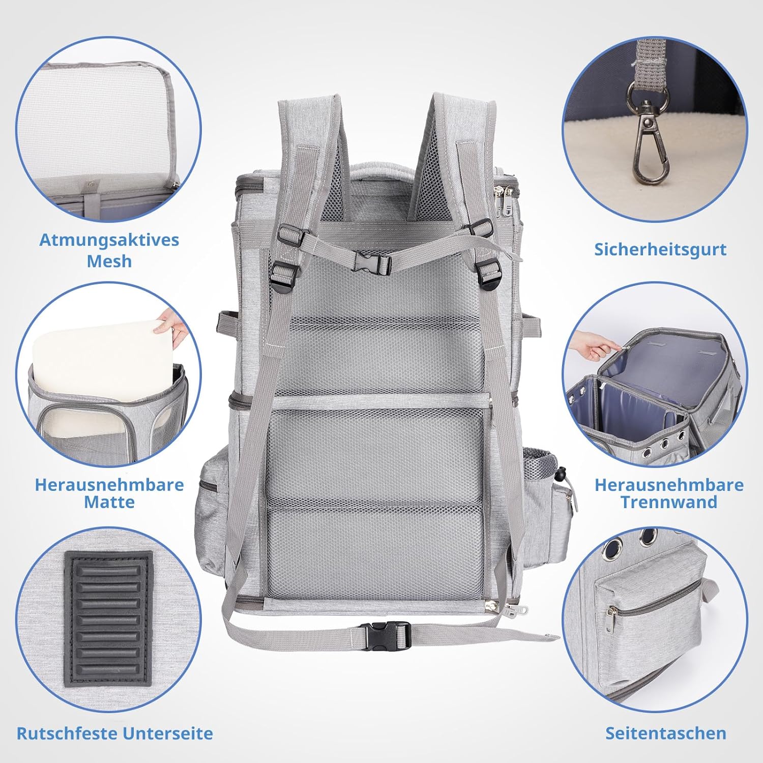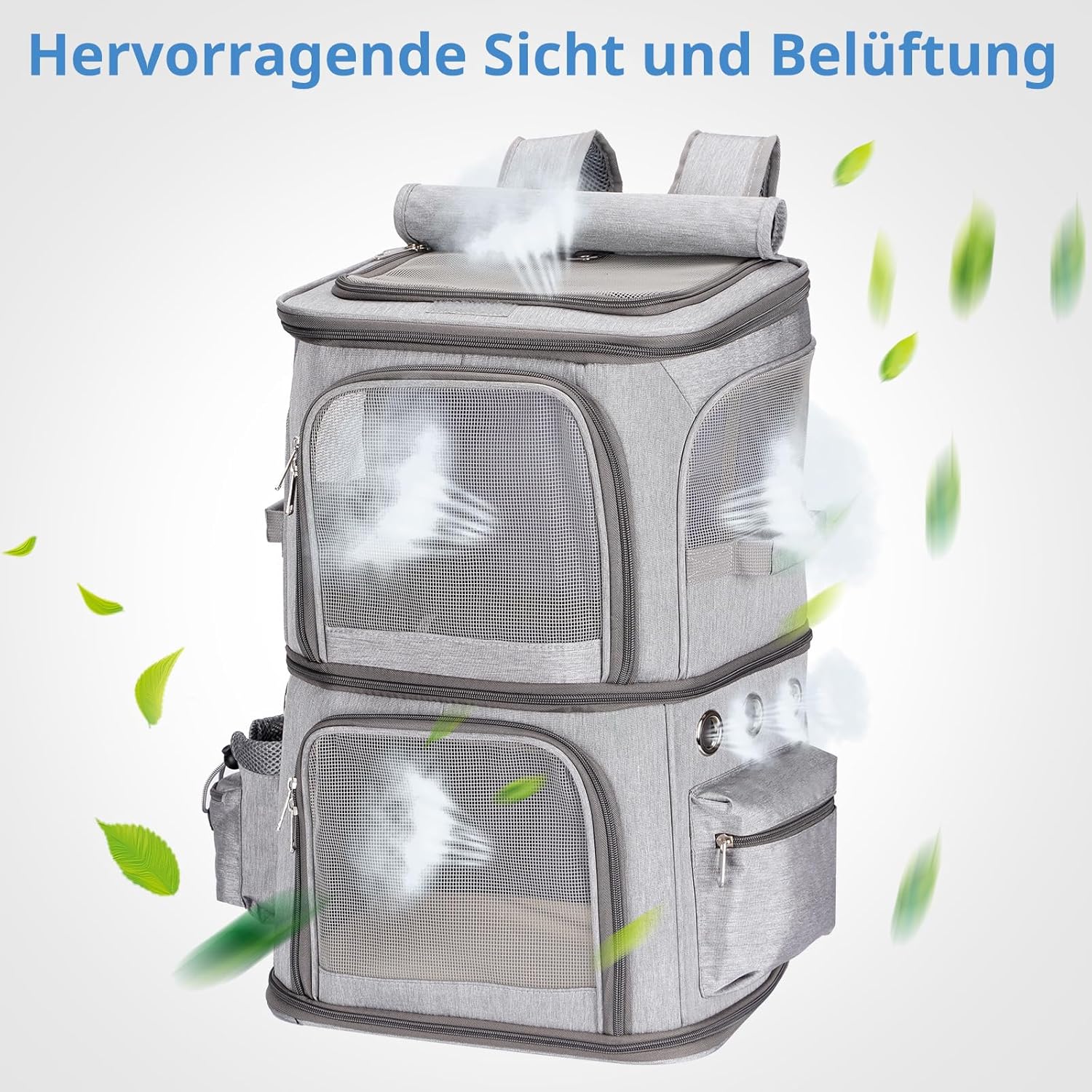 • ПРЕВЪЗХОДНА ВЕНТИЛАЦИЯ И ВИДИМОСТ Разполага с 5 дишащи мрежести прозореца и 6 вентилационни отвора от 4 страни на раницата, за да осигури изобилие от въздух и чудесна видимост за вашия домашен любимец. С горни и предни ципове, вашите прекрасни домашни любимци могат лесно да се поставят и изваждат от раницата.