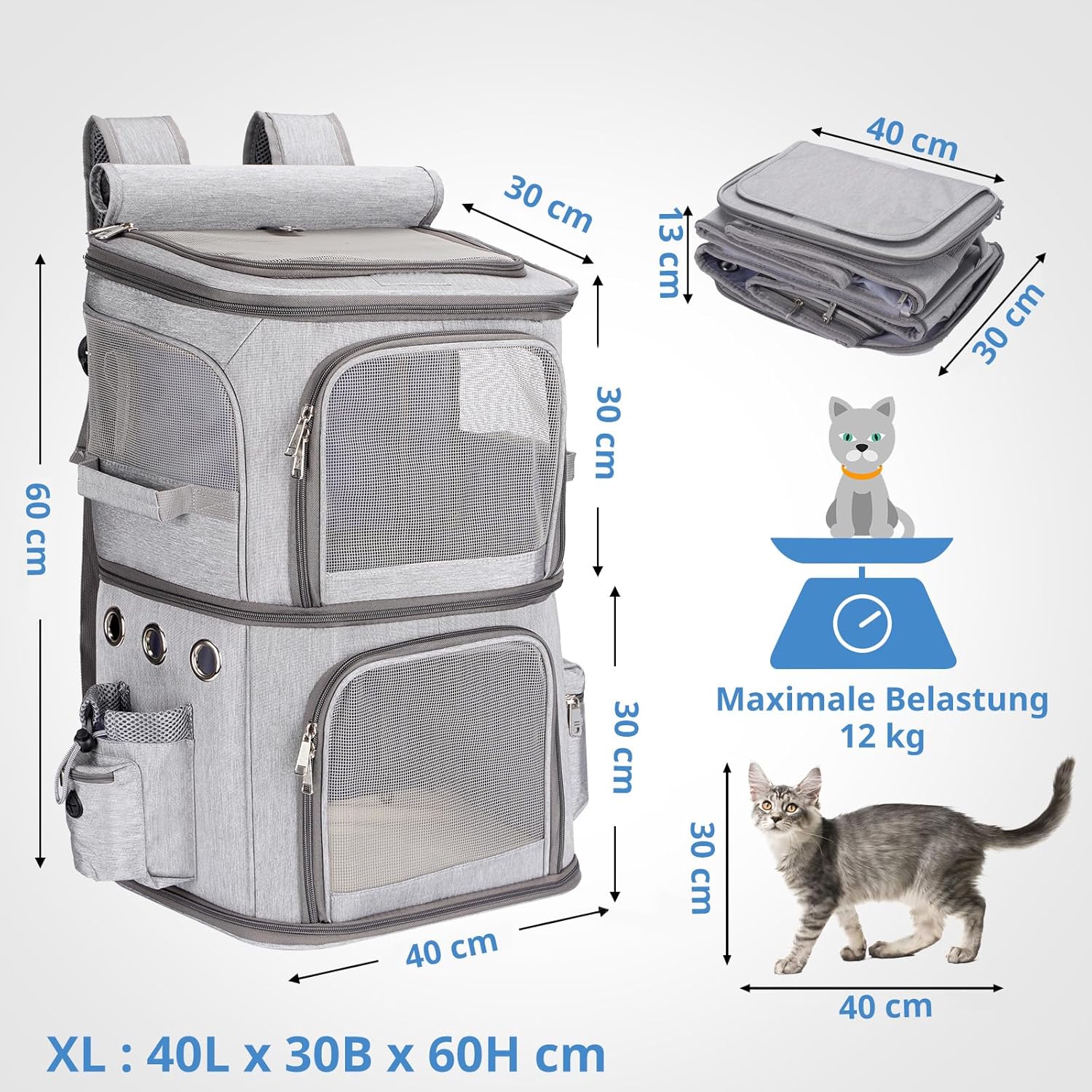 Транспортна кутия за 2 котки, Раница за големи котки до 12 кг, Идеална за пътуване/туризъм/къмпинг, Сива, XL
