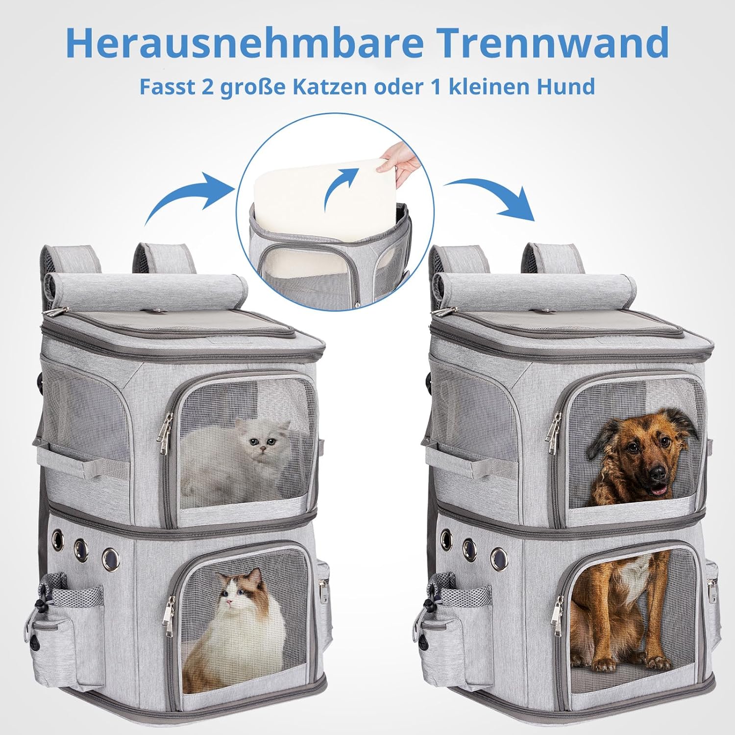 • ДИЗАЙН С ДВОЙНИ ОТДЕЛЕНИЯ Разполага с 2 отделни отделения с цип за 2 малки домашни любимци. Можете също да премахнете разделителя и да превърнете 2 отделения в 1, за да поберете 1 малък до среден домашен любимец, подходящ за хора, които имат няколко малки домашни любимци.
