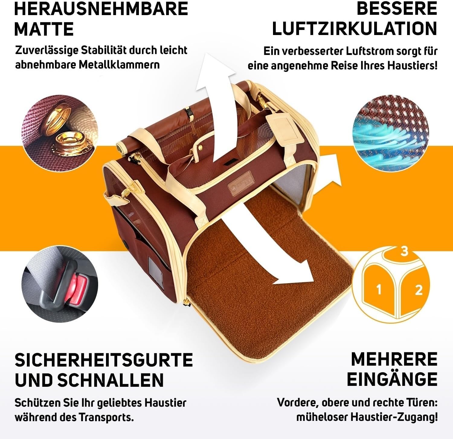 • Безопасността е на първо място и PETPROVED са помислили за всичко - за да се осигури допълнително сигурно закрепване, са предвидени две дръжки за предпазния колан. А ако имате пакостлив спътник - не се притеснявайте! Циповете са с технология за автоматично заключване, която може да се отваря само на ръка. Уверете се, че вашият домашен любимец е удобен и безопасен по време на пътуване!