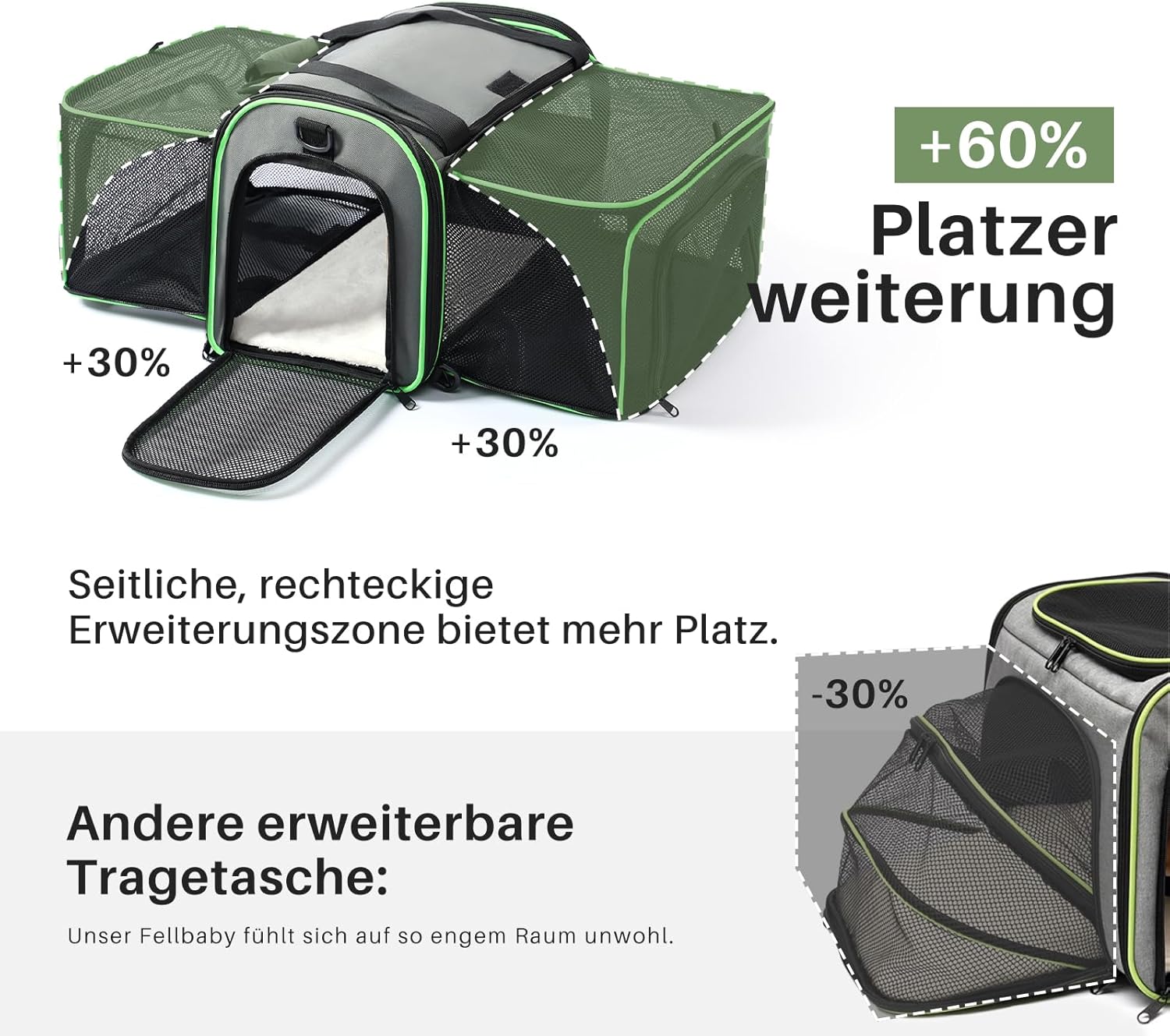 • ДИЗАЙН С ДВОЙНО РАЗШИРЯВАНЕ НА ПРОСТРАНСТВОТО С разтегателни странични стени, които надхвърлят стандартните кошници за котки/кучета, този дизайн увеличава вътрешното пространство с 60% при разгъване, осигурявайки на вашия домашен любимец достатъчно място за релакс и почивка.