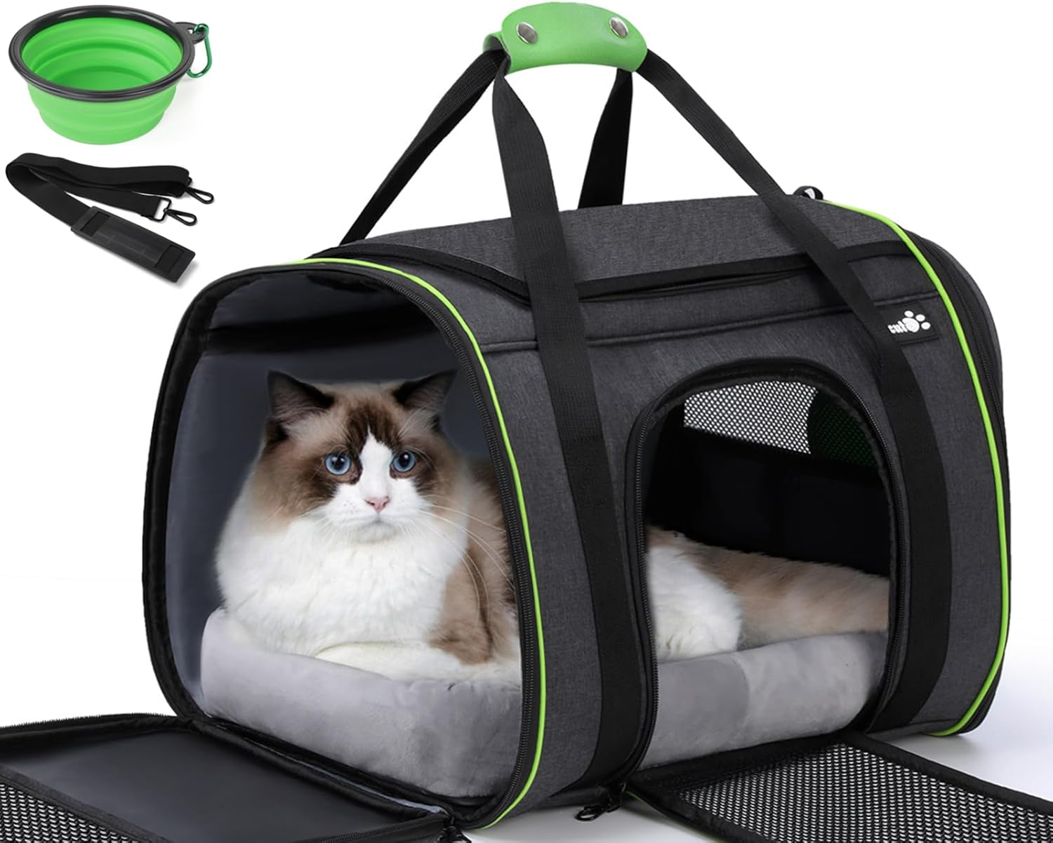 • Размери: размер на транспортната кутия: 44 x 33 x 32,5 см. За повечето авиокомпании е разрешено дори да вземете сгъваема клетка за кучета, която отговаря на размерите на стандарта за ръчен багаж (55 x 40 x 20 см) и тежи максимум 6 кг с кучето ви в пътническия салон. Максималното тегло на чантата за кучета е 6 кг, препоръчваме теглото на зареденото животно да е по-малко от 9 кг, за да се осигури по-добро използване на продукта.