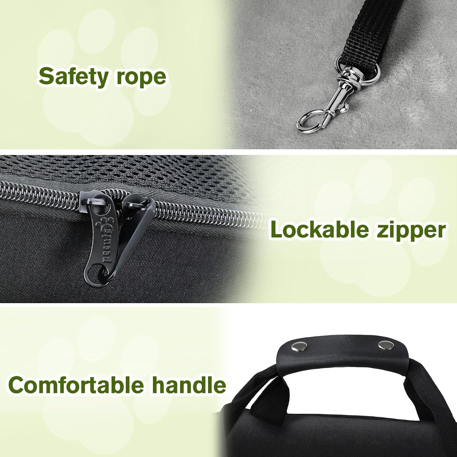 • Удобна и безопасна: Нашата кошара за котки има плюшена възглавница вътре, която може да се разгъне на разтегателна страна, за да осигури удобно място за вашия домашен любимец. Кутията за котки може да се сгъва за съхранение, лесна е за носене и лесна и удобна за сглобяване. Кошарката има опция за съхранение на закуски и аксесоари за домашни любимци и е оборудвана с предпазно въже, както и двупосочен цип от цинкова сплав с кука, за да се предотврати бягството на домашните любимци чрез отваряне на ципа отвътре.