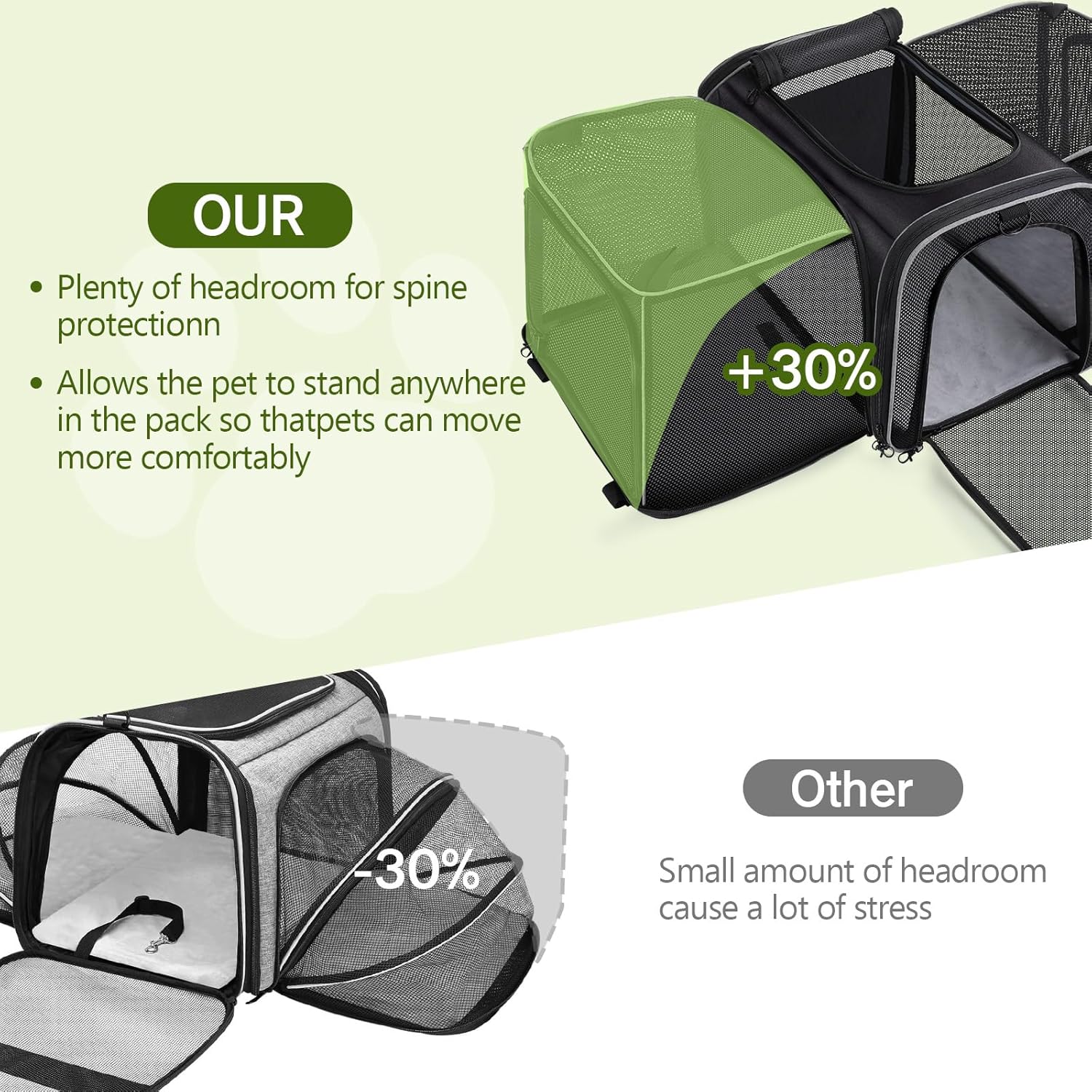 • Голямо пространство с двойно удължение: двете страни на нашата кутия за транспортиране на котки могат да се удължат, за да се увеличи пространството за активност на вашия домашен любимец, от 47 x 34 x 33 см до 88 x 38 x 31 см, когато почивате по време на пътуването, това може да осигури на домашните любимци по-голямо и по-комфортно място за почивка.