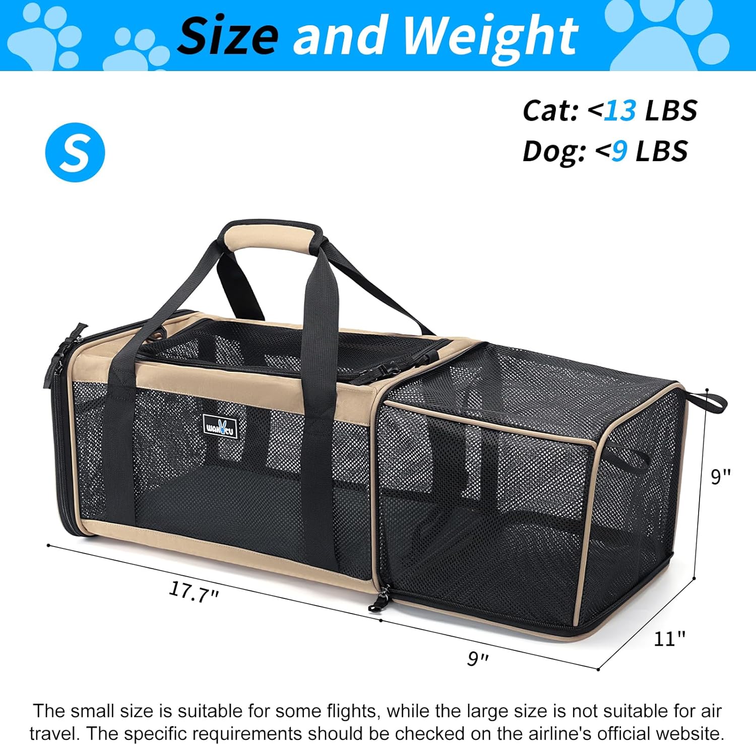 Транспортна кутия за котки Wakytu, одобрена за полети разширяема чанта за транспортиране на домашни любимци за малки котки, сгъваема чанта за пътуване с 600D Oxford, предпазен цип