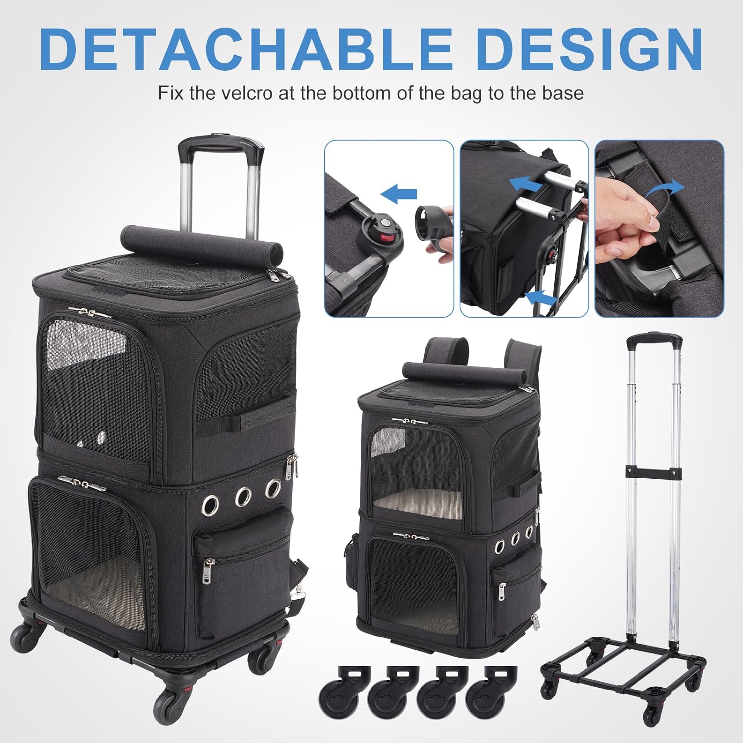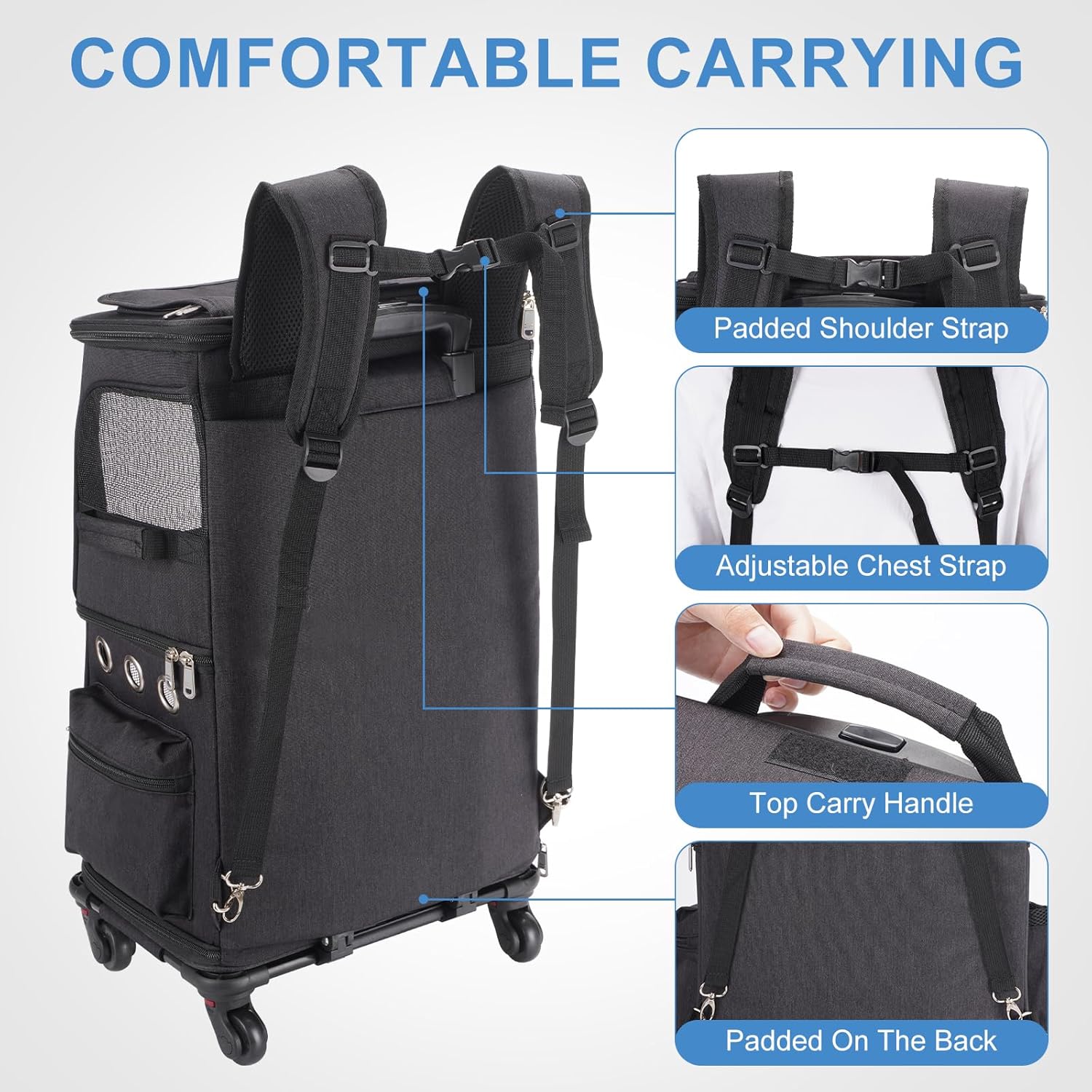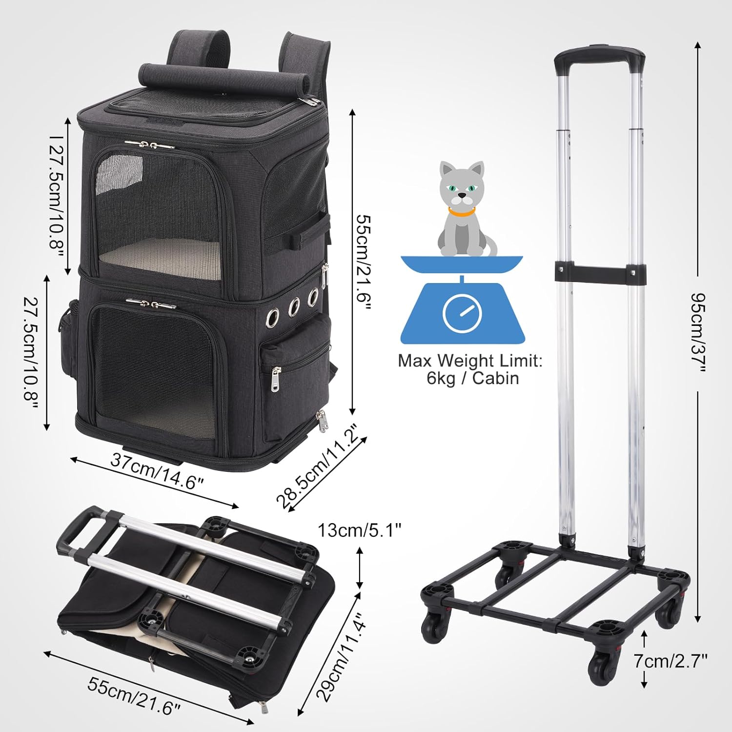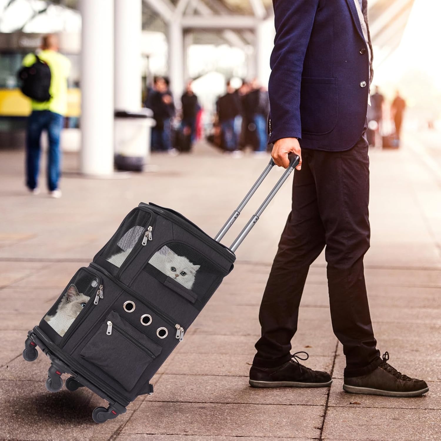 Транспортна кутия за котки за 2 котки до 12 кг, Транспортни кутии за малки кучета с подвижни колела, Сгъваема чанта за транспорт на котки, Черна