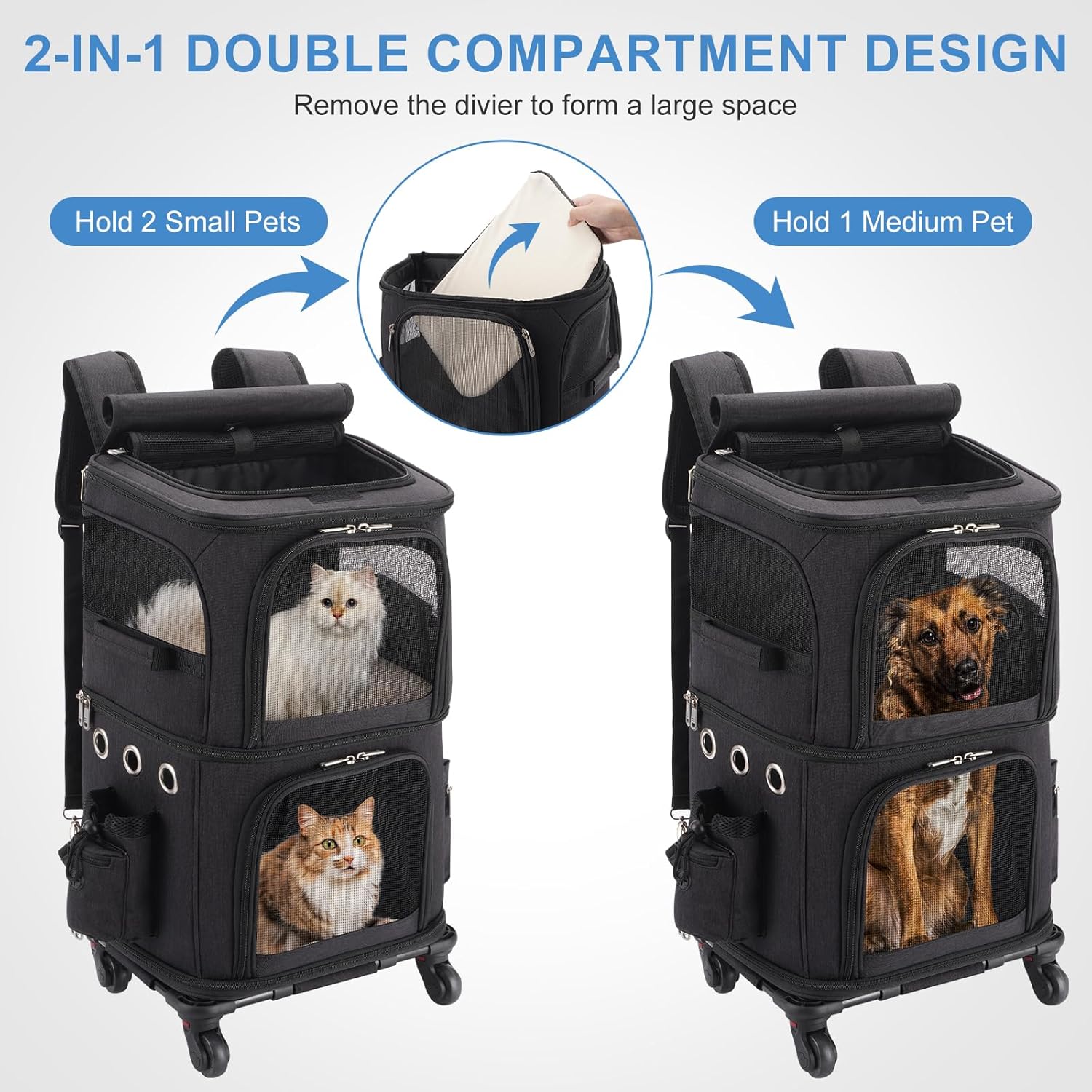 • ДИЗАЙН С ДВОЙНИ ОТДЕЛЕНИЯ Разполага с 2 отделни отделения с цип за 2 малки домашни любимци. Можете също да премахнете разделителя и да превърнете 2 отделения в 1, за да поберете 1 малък до среден домашен любимец. Подходящо за хора, които имат няколко малки домашни любимци.