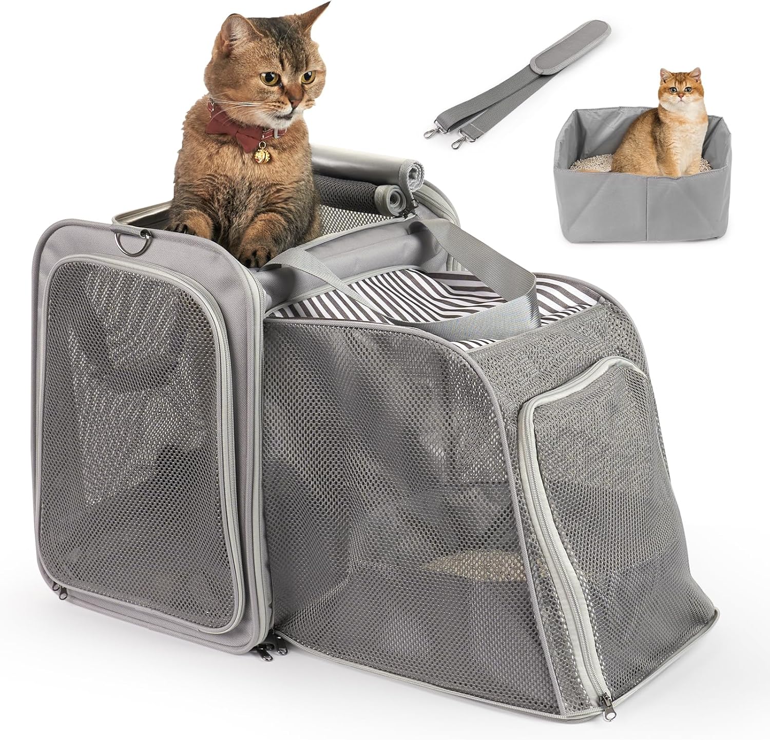 • Разширяем комфорт за дълги пътувания Нашата транспортна кутия за котки може да побере възрастна котка (до 10 кг) и може да се регулира с приблизително 34 см ширина. В компактен режим е с размери 42 x 30 x 42 см, идеална за ежедневна употреба. При необходимост се разширява до 42 x 64 x 42 см. Вградената тоалетна за котки осигурява хигиена и комфорт по време на път. - Вашият перфектен спътник при пътуване за котки.