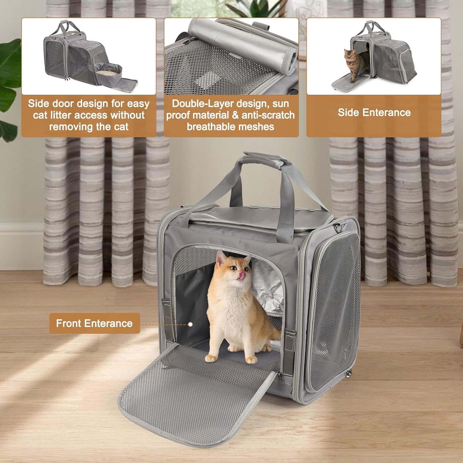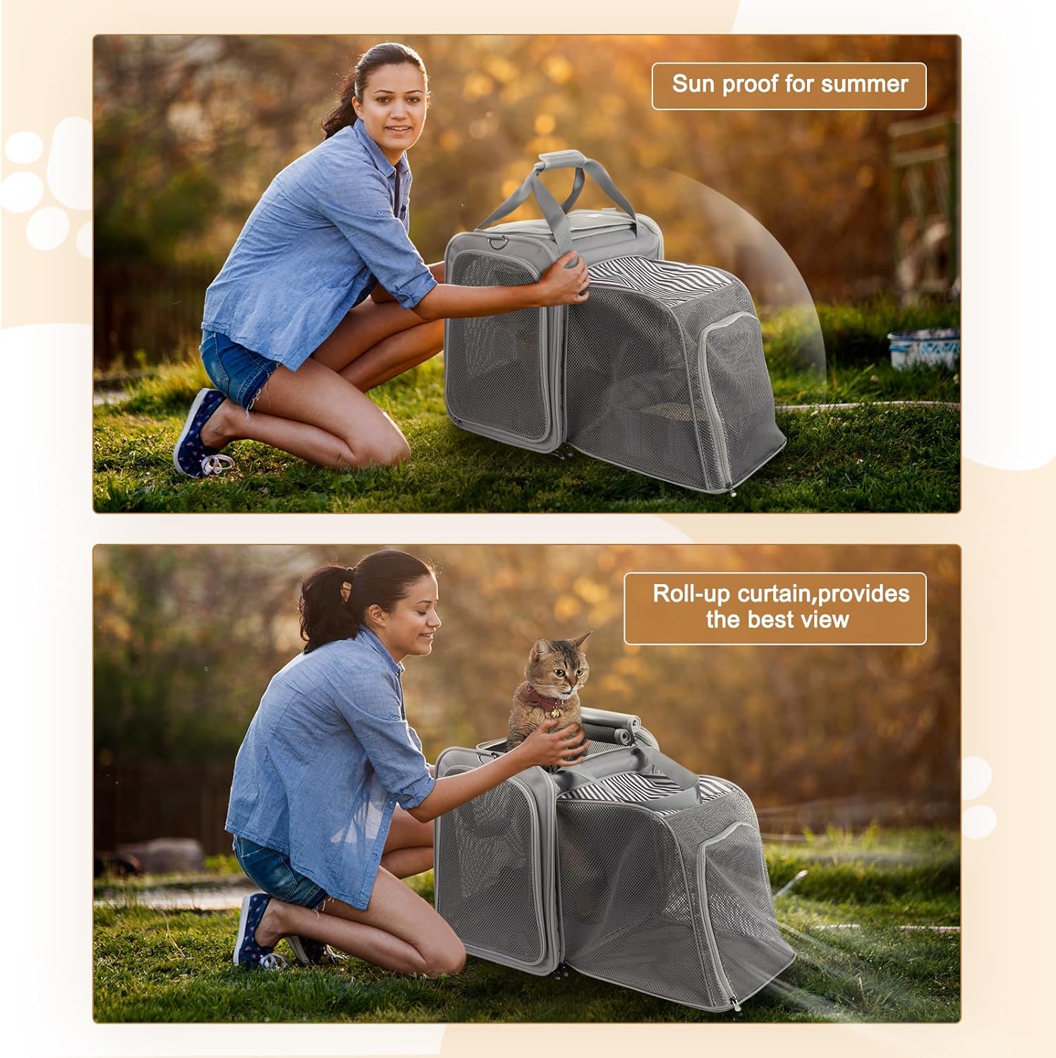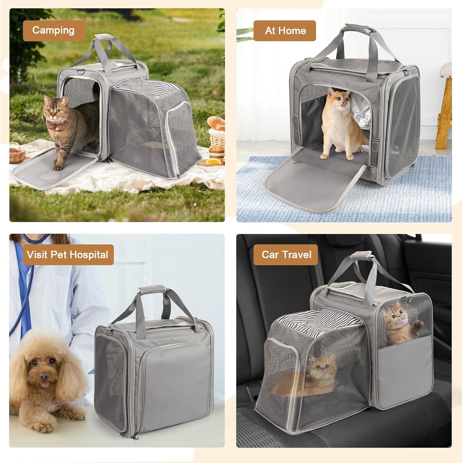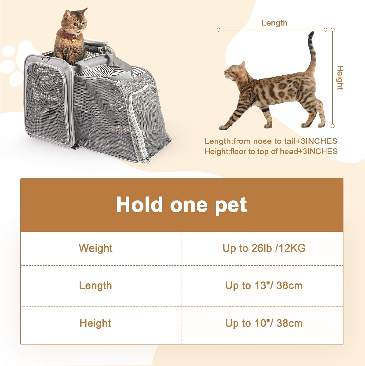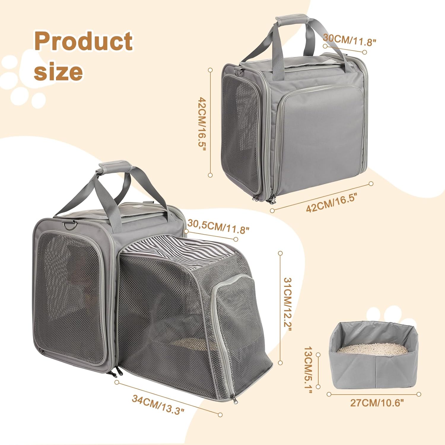 • Разширяем комфорт за дълги пътувания Нашата транспортна кутия за котки може да побере възрастна котка (до 10 кг) и може да се регулира с приблизително 34 см ширина. В компактен режим е с размери 42 x 30 x 42 см, идеална за ежедневна употреба. При необходимост се разширява до 42 x 64 x 42 см. Вградената тоалетна за котки осигурява хигиена и комфорт по време на път. - Вашият перфектен спътник при пътуване за котки.
