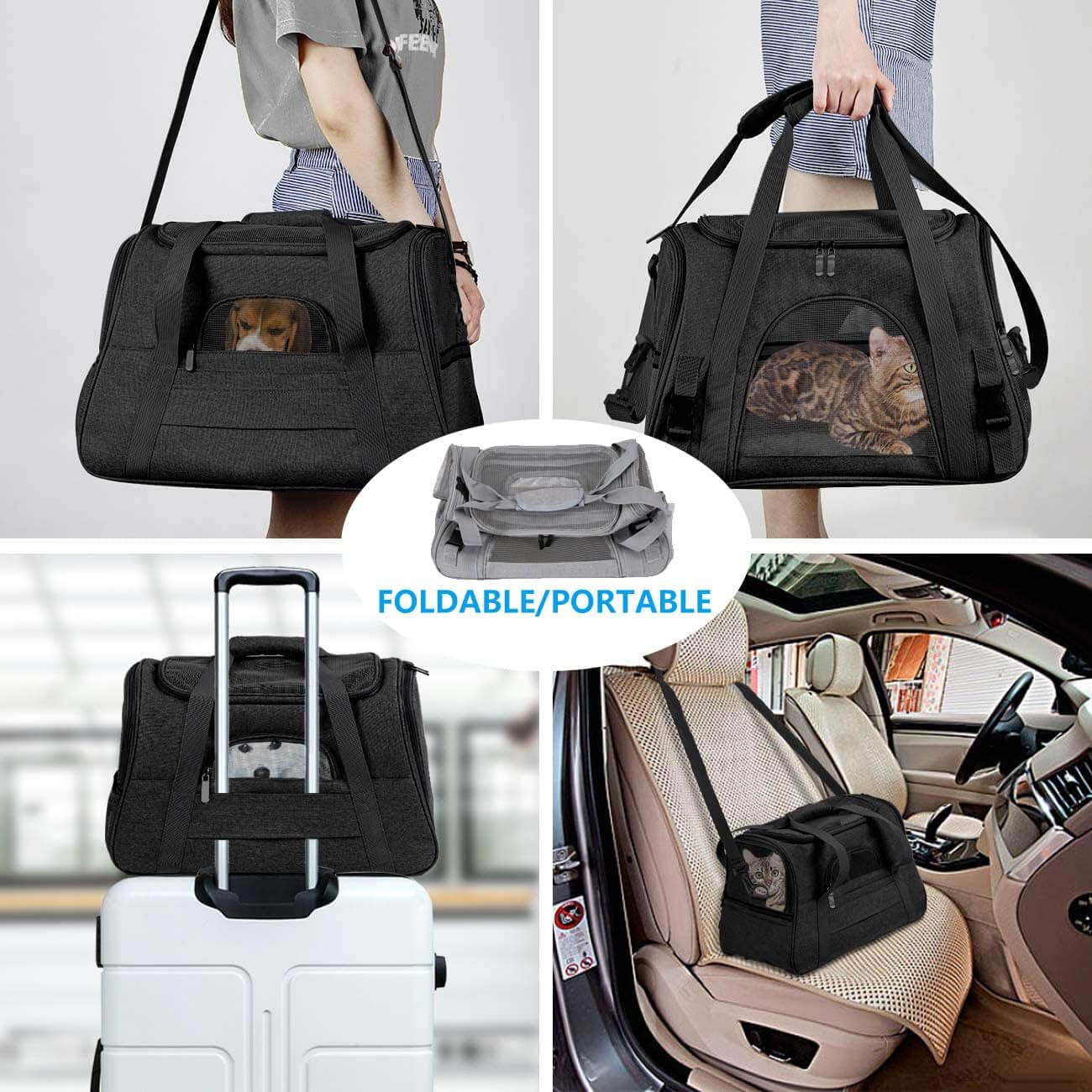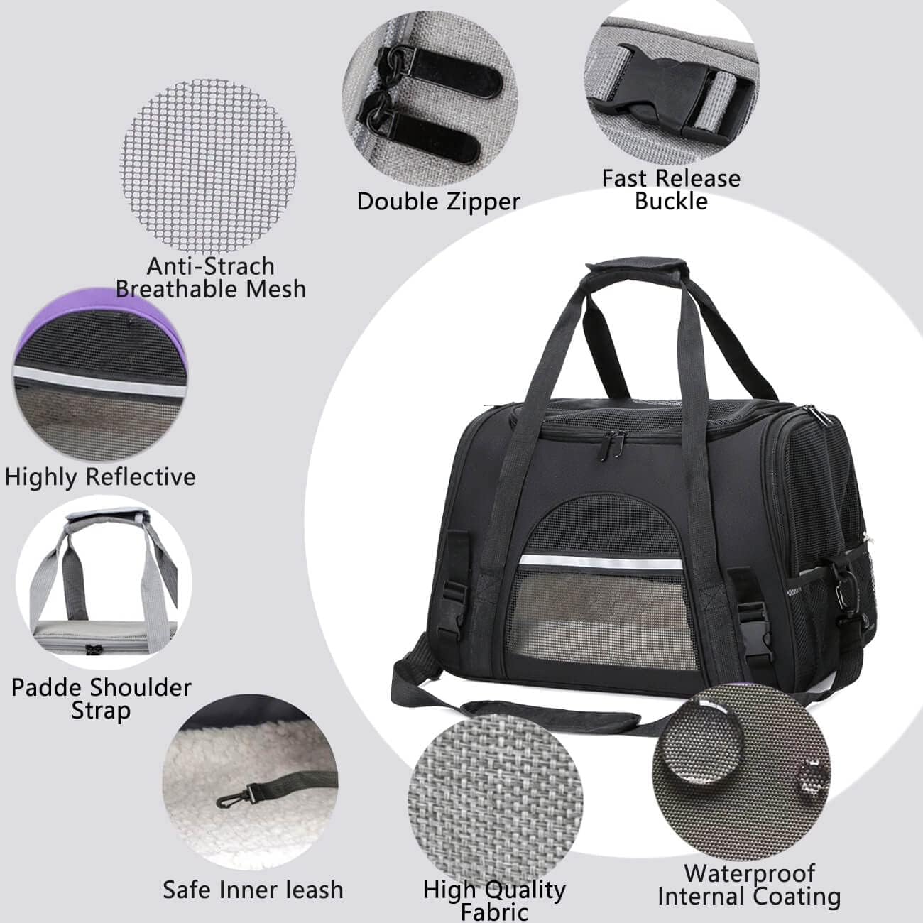 Хуманизиран дизайн: удобните, подплатени презрамки за носене улесняват товаренето, ципът с двупосочен превключвател е лесен за използване, а презрамките на дръжката могат да закрепят чантата за носене на домашни любимци към телескопичния прът на куфара.