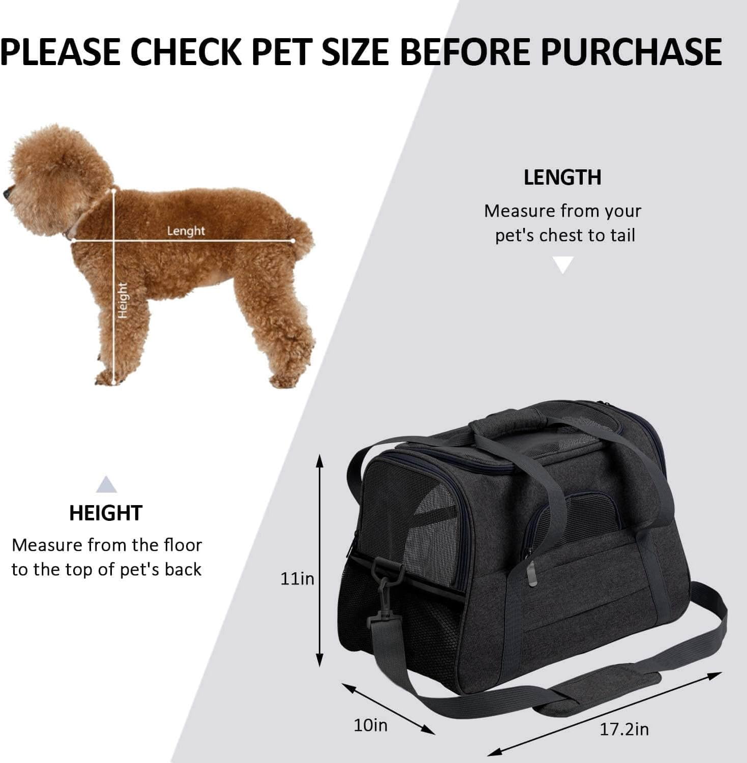 Съвети: Моля, измерете дължината на вашия домашен любимец (от врата до седалището) и височината (от гърба до пода) преди покупка и запазете известно място, за да осигурите комфорта на домашния любимец.