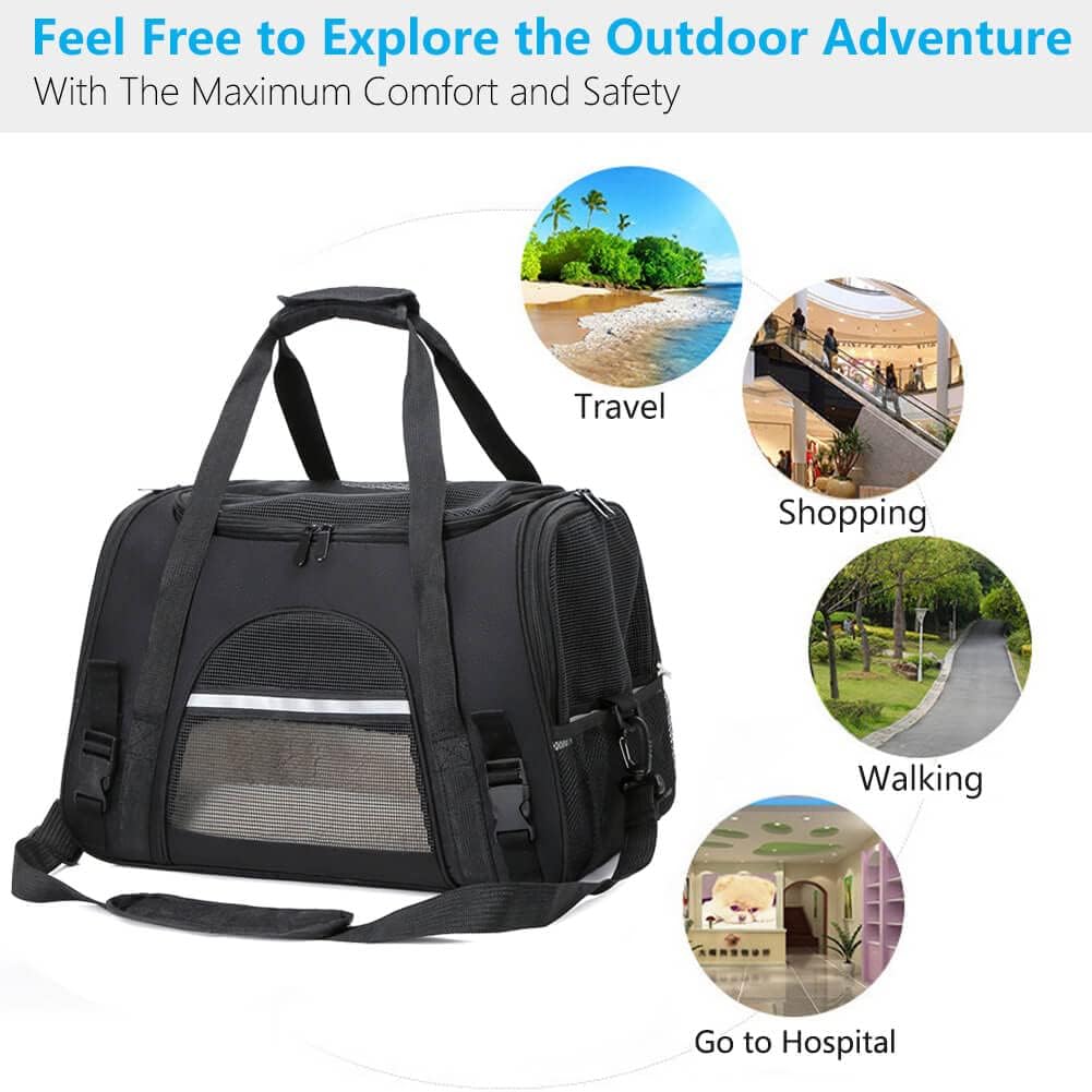 Множество отвори: Големите отвори от лявата и дясната страна и отгоре са удобни за влизане и излизане на домашните любимци, а малкият отвор на гърба е удобен за хранене.