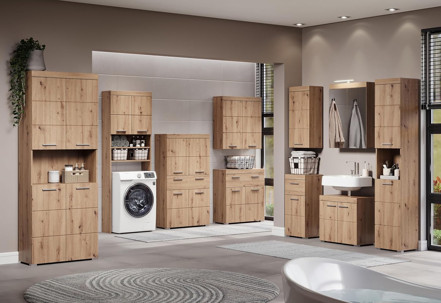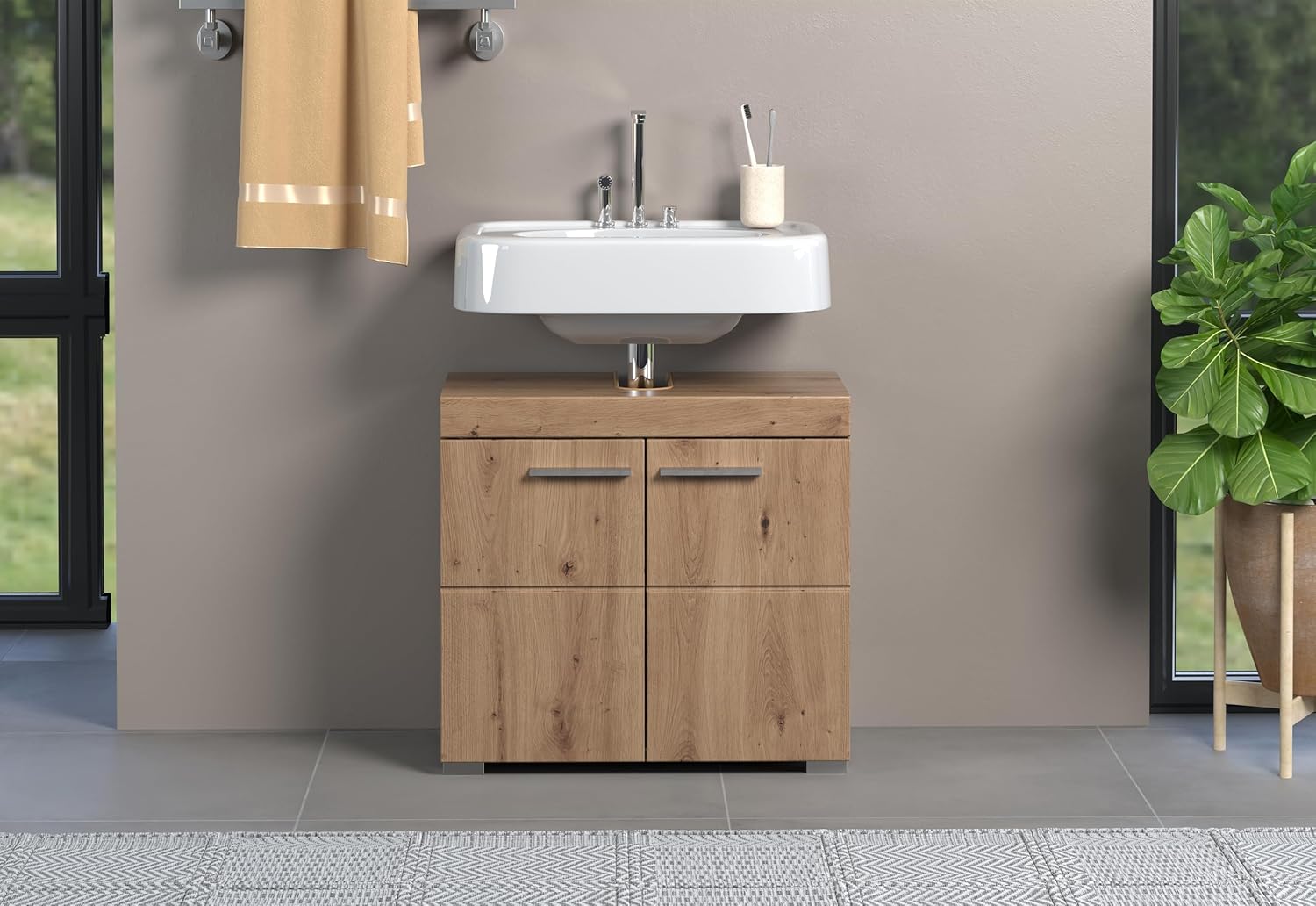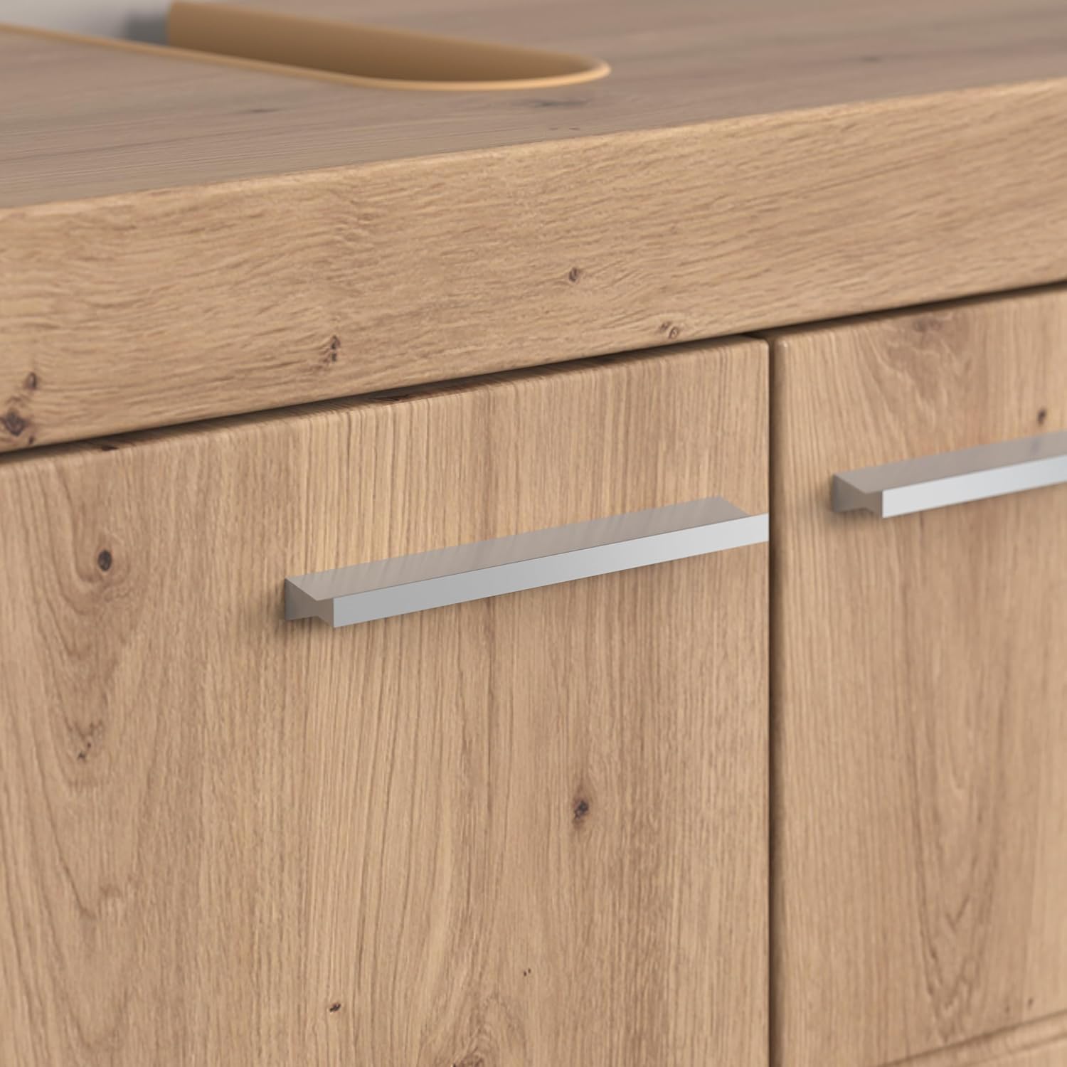 • Описание - Модерен шкаф за мивка с изчистени линии, съчетаващи стил и функционалност. Поддържа банята подредена и се вписва безпроблемно в съществуващия декор благодарение на неутралния си дизайн - идеален както за малки, така и за големи домакинства.