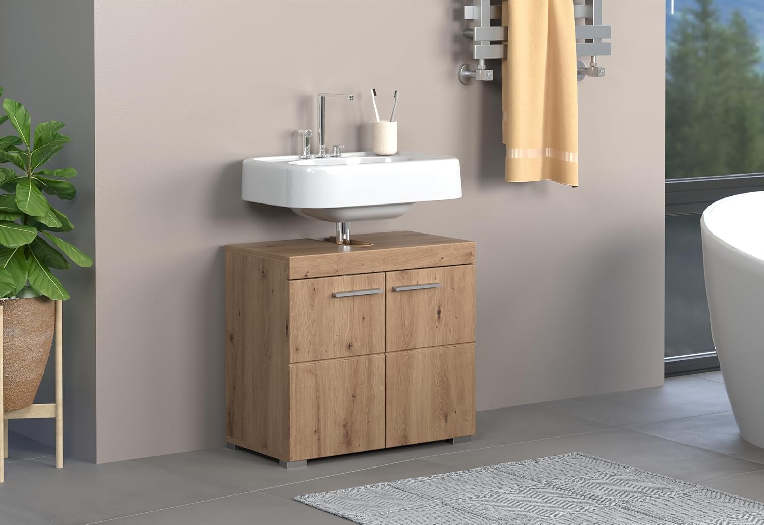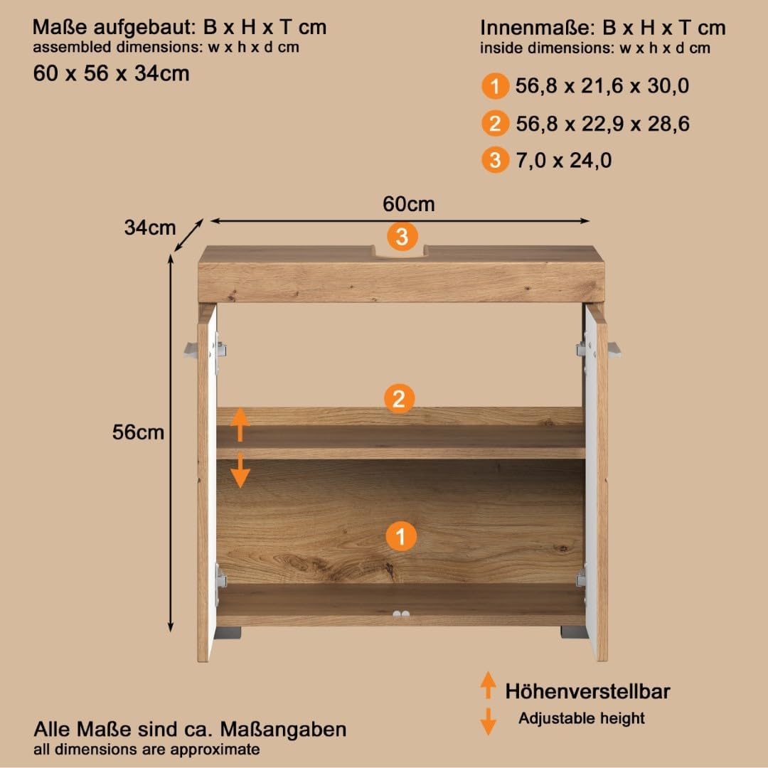 • Компактно и функционално решение - С размери (Ш x В x Д): 60 x 56 x 34 см, пасва под стандартни мивки и е идеален за малки до средни бани, компактни...