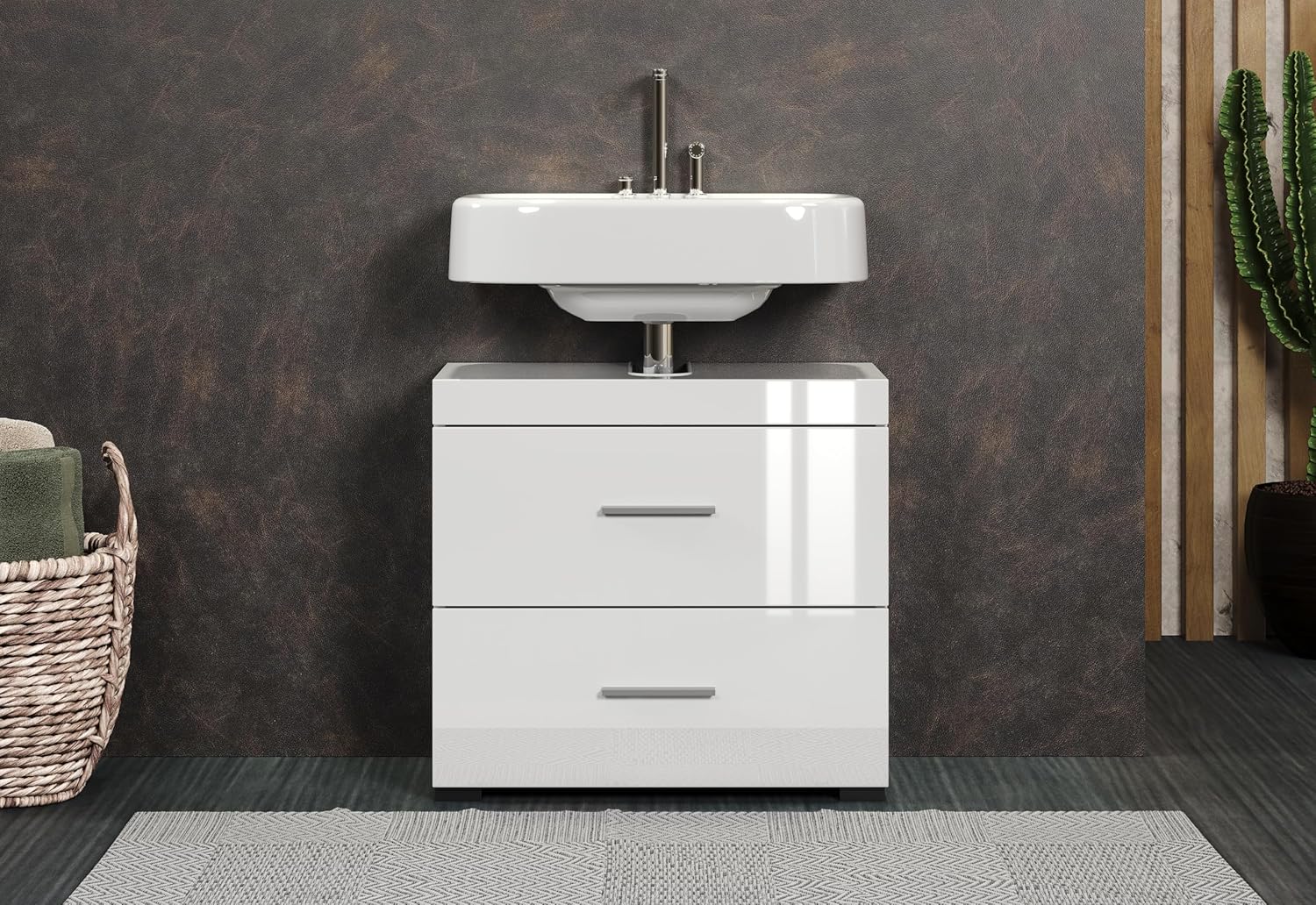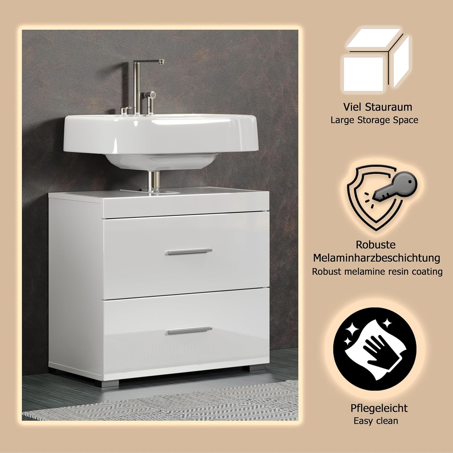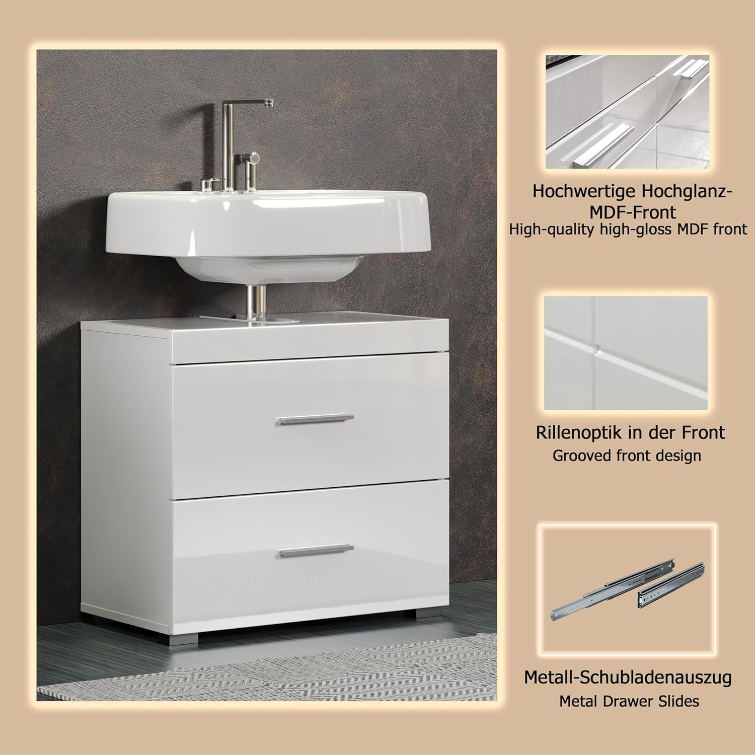 trendteam smart living Amanda – Шкаф за баня – Бял/Бял гланц – 2 чекмеджета с пълно изтегляне – 60 x 56 x 34 см (Ш x В x Д) Устойчив на надраскване и лесен за почистване