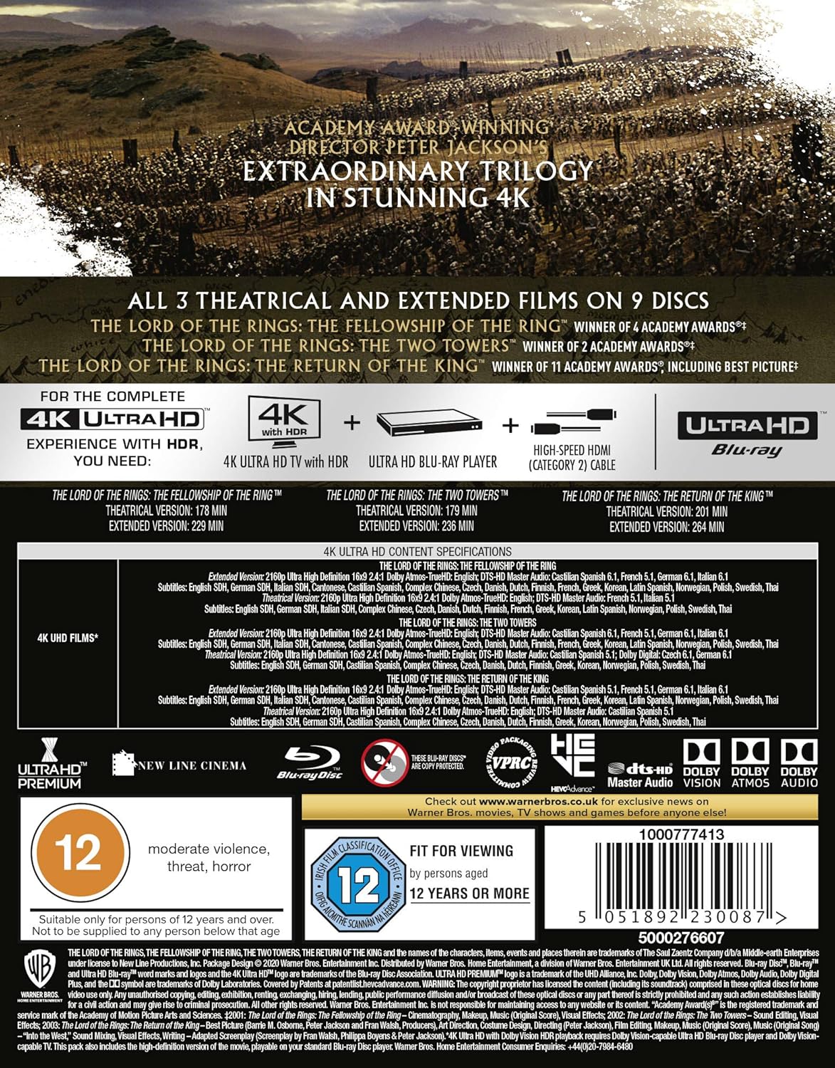 Тази колекция от три филма включва: • Кино и разширено издание на трилогията „Властелинът на пръстените“ в зашеметяващото 4K Ultra HD: • Задругата на пръстена, Двете кули, Завръщането на Кинго на 9 диска • Висококачествен калъф с уникални произведения на изкуството. Върнете се към зашеметяващите места и епичните приключения в сагата за Средната земя на Питър Джаксън „Хобитът!“. И това е то и то - Пръстените. Филмите сега са по-зашеметяващи от всякога и са красиво ремастерирани в 4K UHD под ръководството на режисьора Питър Джаксън и реставрирани от Park Road Post. Открийте зашеметяващите места и епичните приключения в най-великата филмова сага на всички времена. Аплодираната от критиката поредица от шест филма включва трилогиите „Хобитът“ и „Властелинът на пръстените“ и разказва митичните истории за древен свят, наречен Средната земя: свят на елфи, джуджета, магьосници, хора и хобити в постоянната битка срещу злите сили на Черния лорд Саурон и неговата армия от гоблини и орки - свят, пълен с куестове. Дракон, Дракон, Дракон и легендарна последна битка за бъдещето на самата Средна земя. Приключението продължава с трилогията „Властелинът на пръстените“, когато с помощта на спътниците на пръстена, племенникът на Билбо Багин, Фродо, се впуска в опасна мисия, за да унищожи Единствения пръстен и да победи Черния лорд Саурон и неговите войски. Скоро общността е разбита и докато останалите членове се борят със злото, което се разпространява в Средната земя, Фродо и неговият приятел Самуайз трябва да продължат опасната си мисия с водач, на когото не могат да се доверят, към огньовете на Планината на съдбата, като последна битка за Средната земя. Забележка: статията е във формат 4K и трябва да бъде на Ultra HD Blu-ray (4K). K))-Player ababto може да се възпроизвежда.