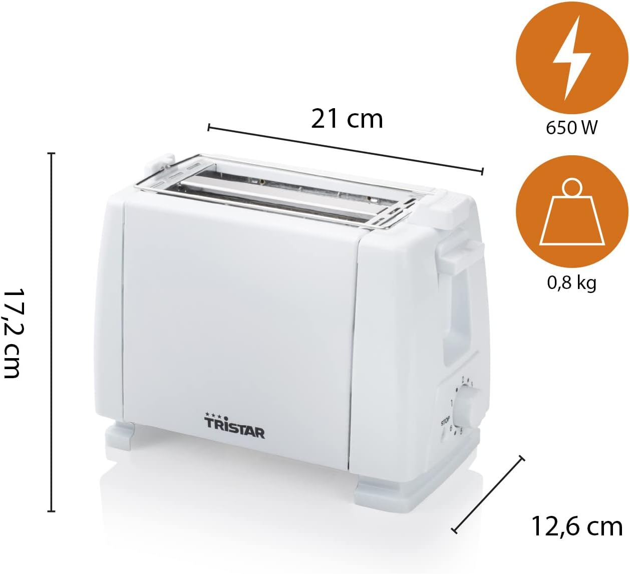 Tristar BR-1009 Тостер за 2 филии, 650 вата, 2 къси слота, 6 нива на изпичане и функция за затопляне на хляб - бял