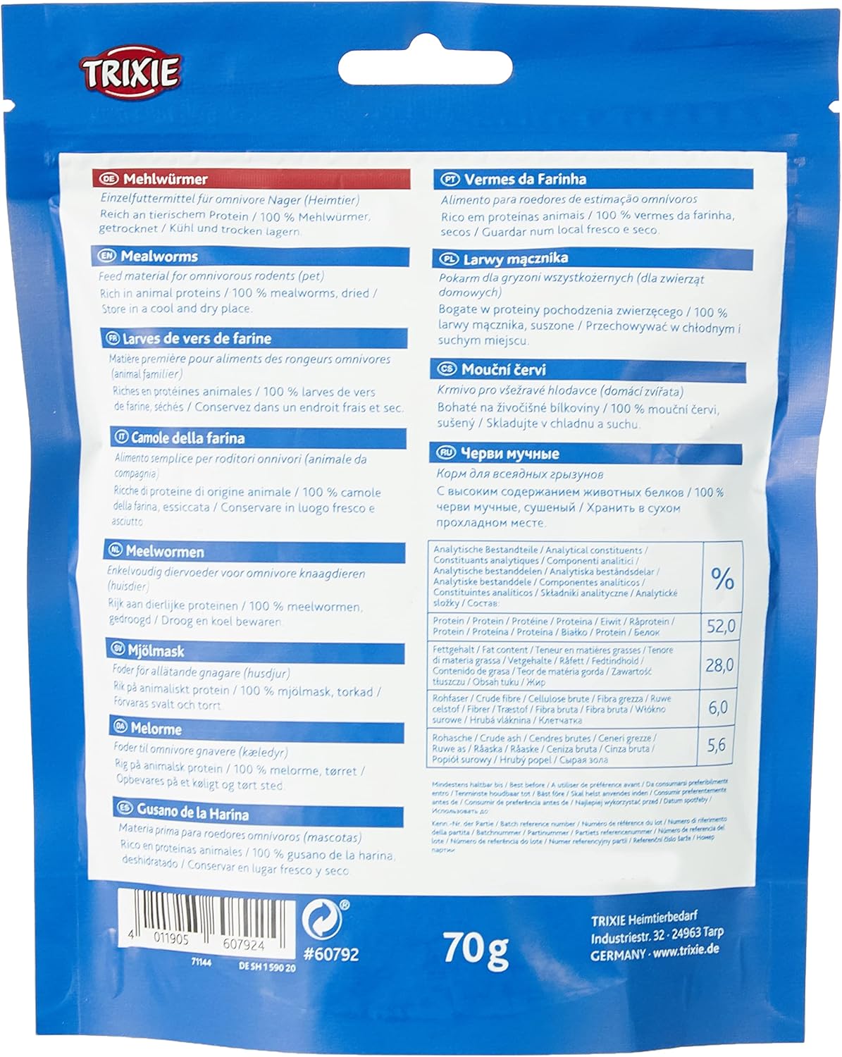 Хранете домашния си любимец със сушените брашнени червеи или ги използвайте като допълнение към редовната му диета. Съхранявайте на хладно и сухо място.