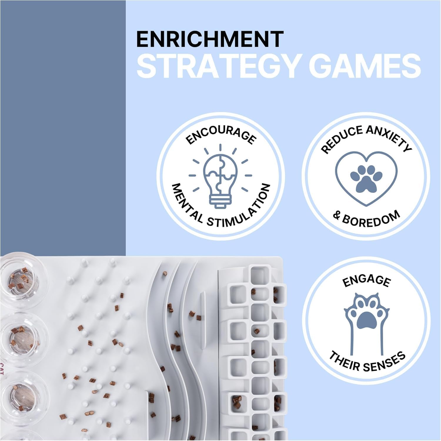 Забавната дъска за котешки занимания се състои от основна дъска с пет различни модула и изисква използването на различни сетивни органи. Всеки модул представлява нова задача за котката, която трябва да бъде решена чрез помирисване, натискане или виждане. Поставянето на лакомства или играчки ще събуди интереса на котката. Тя насилва наградата и се опитва да я улови чрез стратегия, сръчност и постоянство.