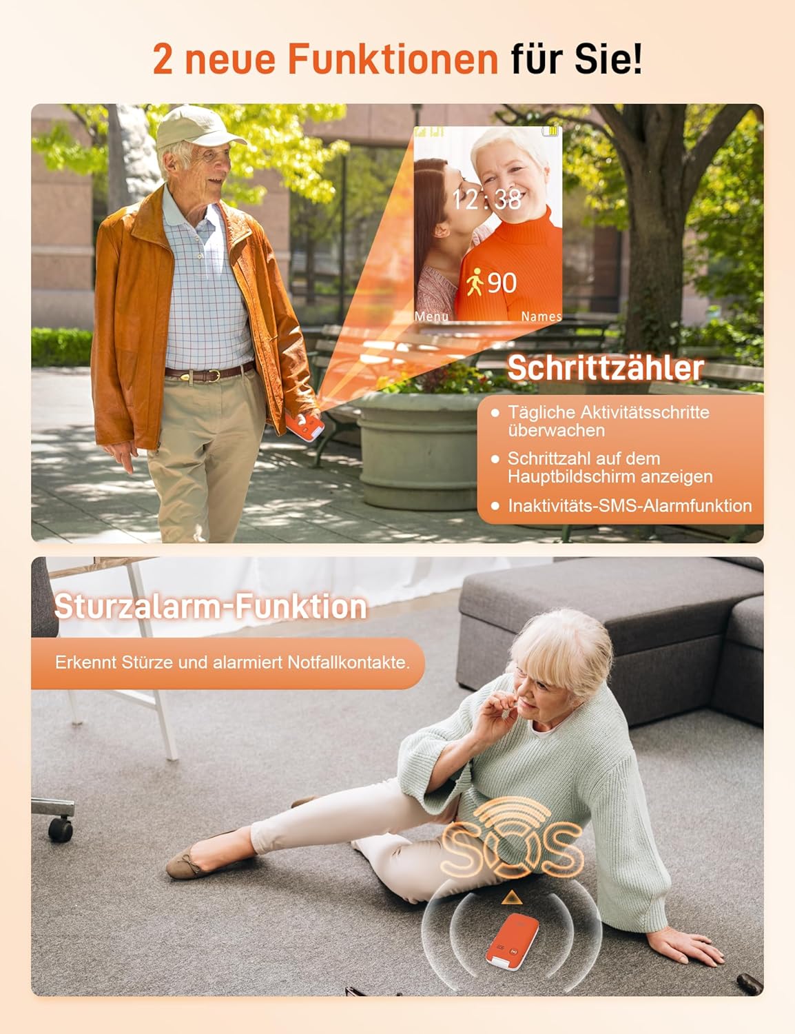 Аларма за падане, Крачкомер, Бутон за спешно повикване SOS, Функция за бързо набиране: M1, M2, M3 и #2 - #9, Гласово съобщение за клавишите
