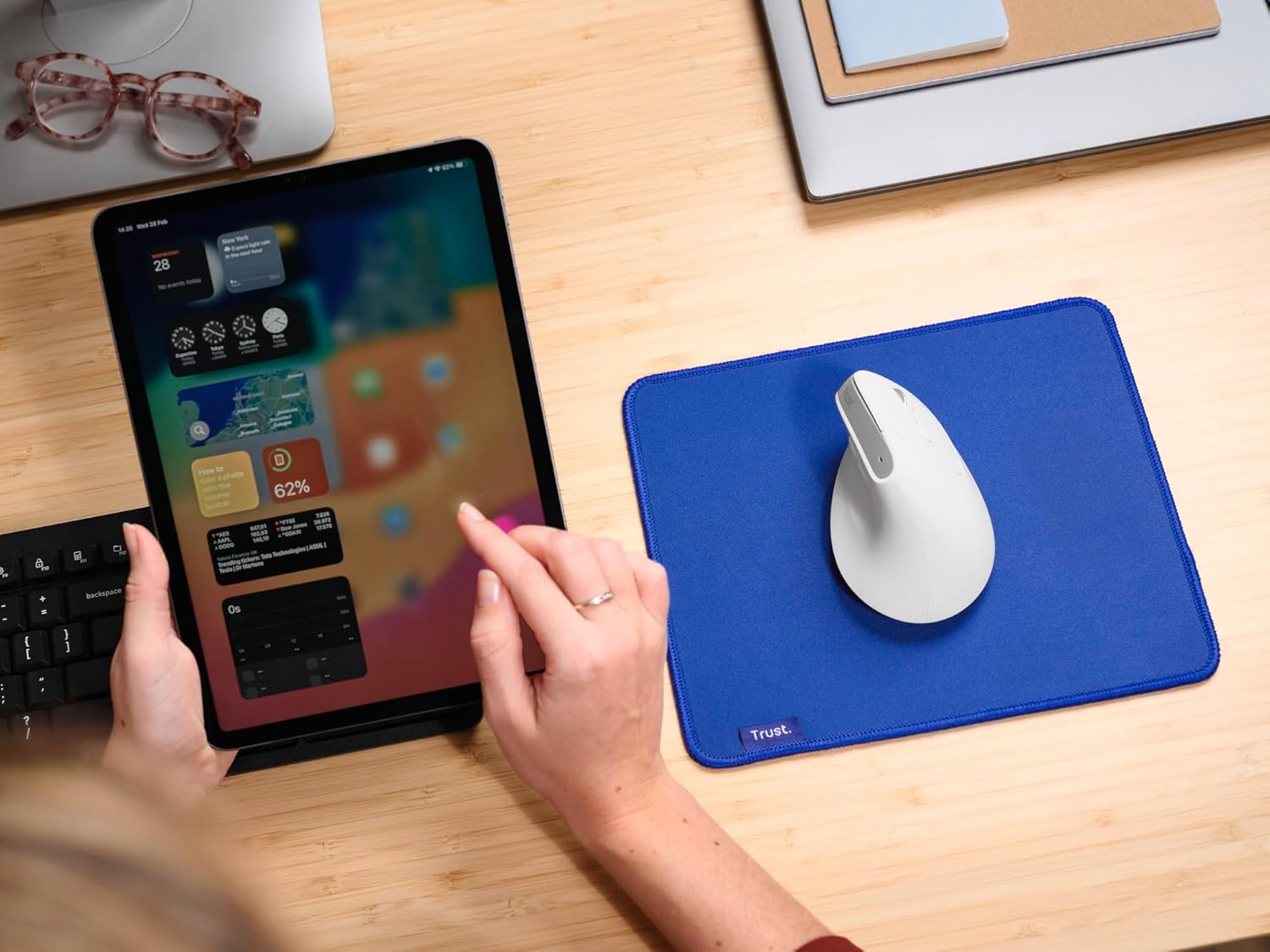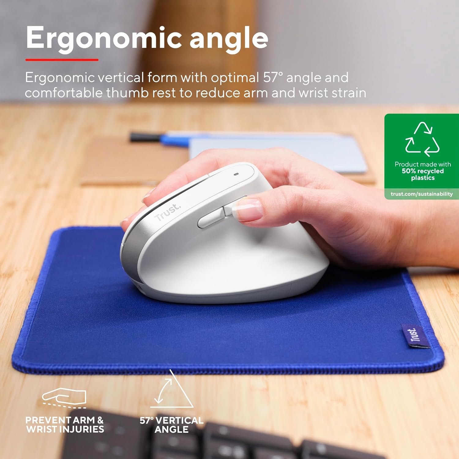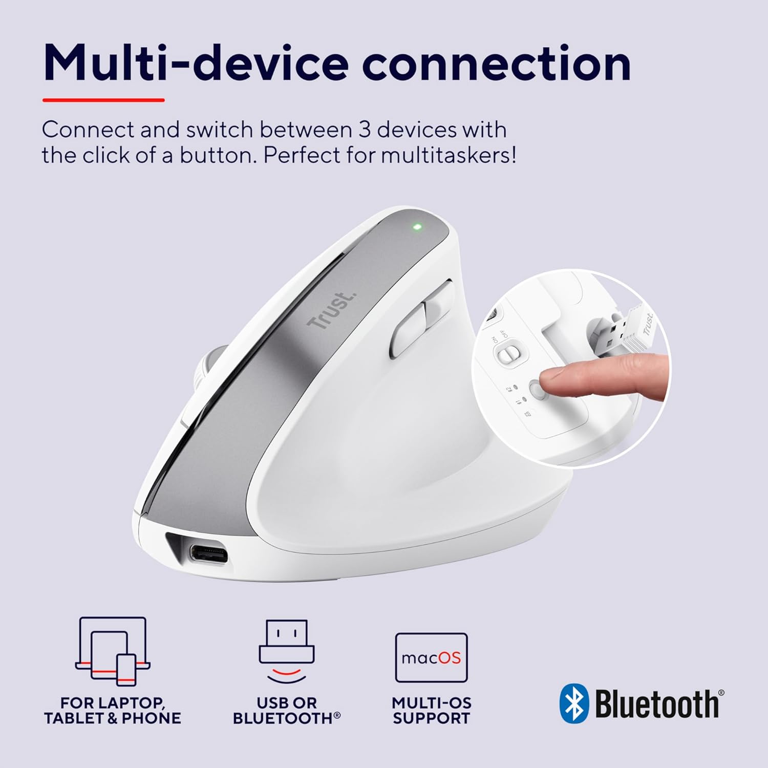 Trust Bayo+ Акумулаторна вертикална мишка Bluetooth + RF 2.4GHz, предотвратяване на синдром на ръката/тенис лакътя на мишката (RSI), 53% рециклирана пластмаса, безжична ергономична мишка за компютър, лаптоп, Mac - бяла