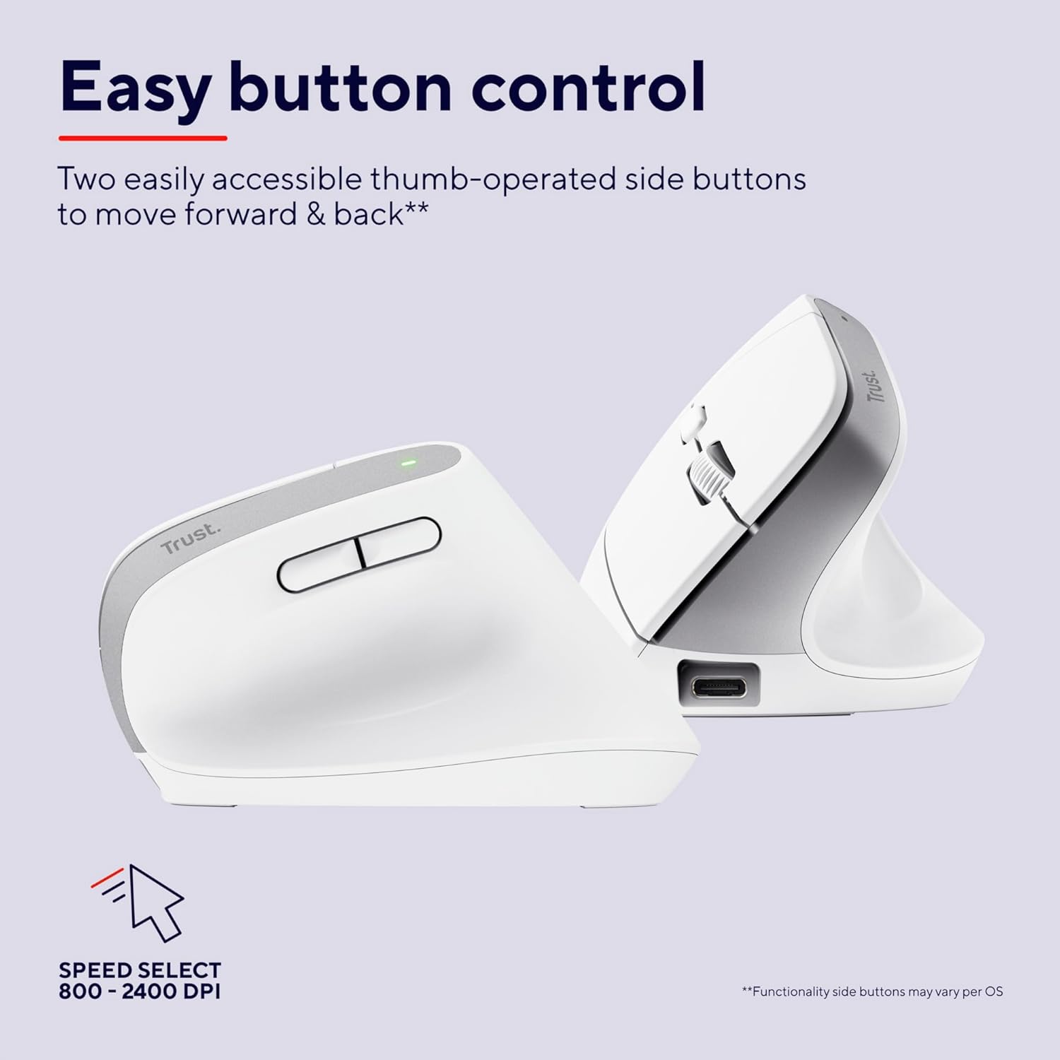 • Прецизен контрол - Ергономичността не е нужно да бъде скучна. Оптичният сензор на вертикалната мишка позволява две скорости: 1000/1600 DPI. Два бутона за палец осигуряват прецизен и бърз контрол.