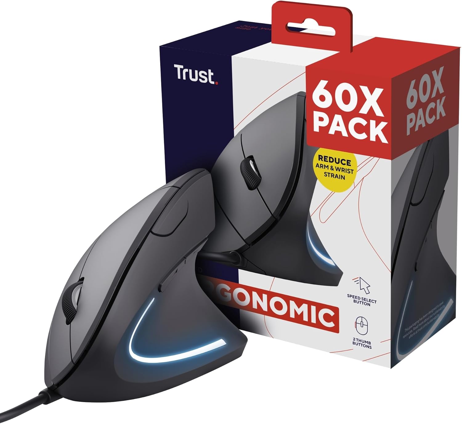 • Край на претоварването - Тази вертикална мишка предпазва от претоварване и болка. Ергономичният дизайн осигурява естествен ъгъл от 60° на ръката и китката, така че работата е лесна за ръката.