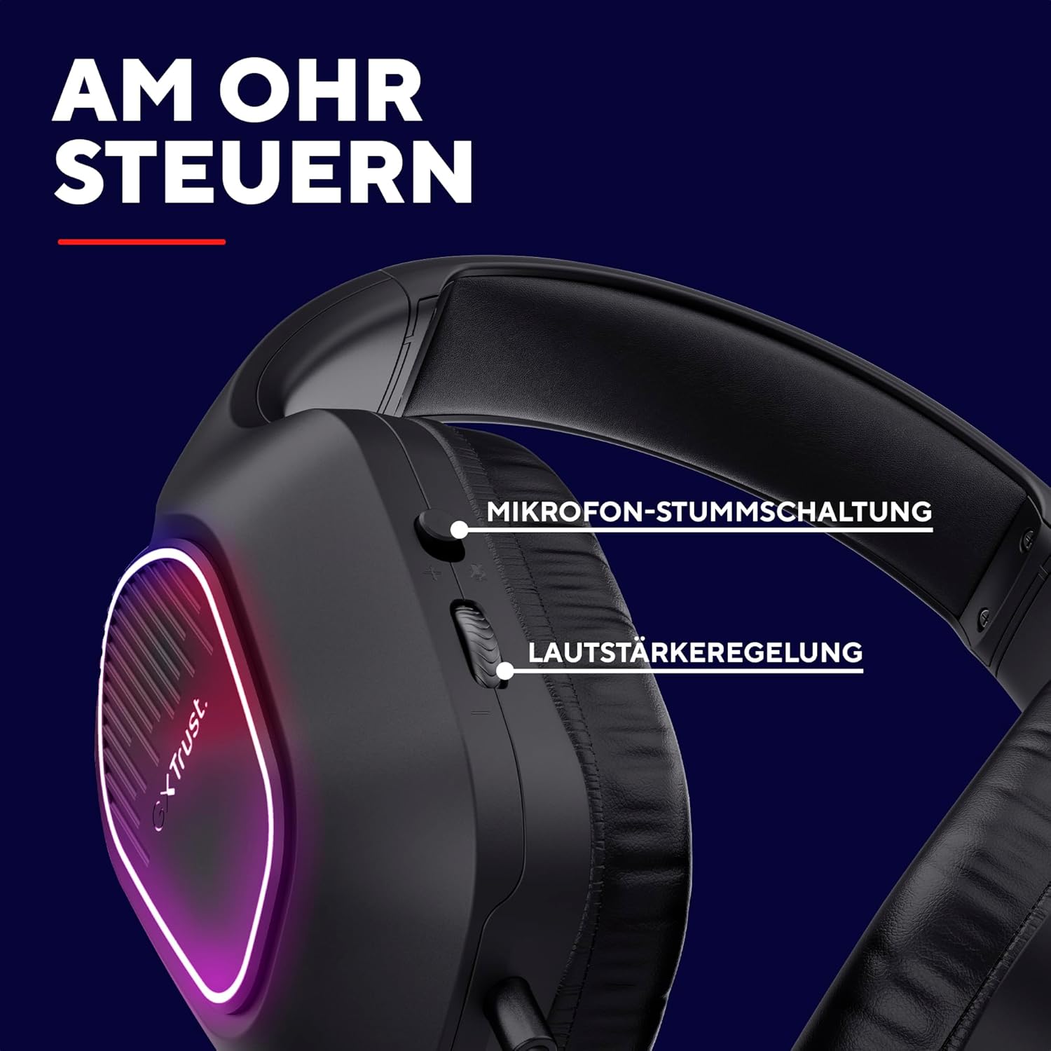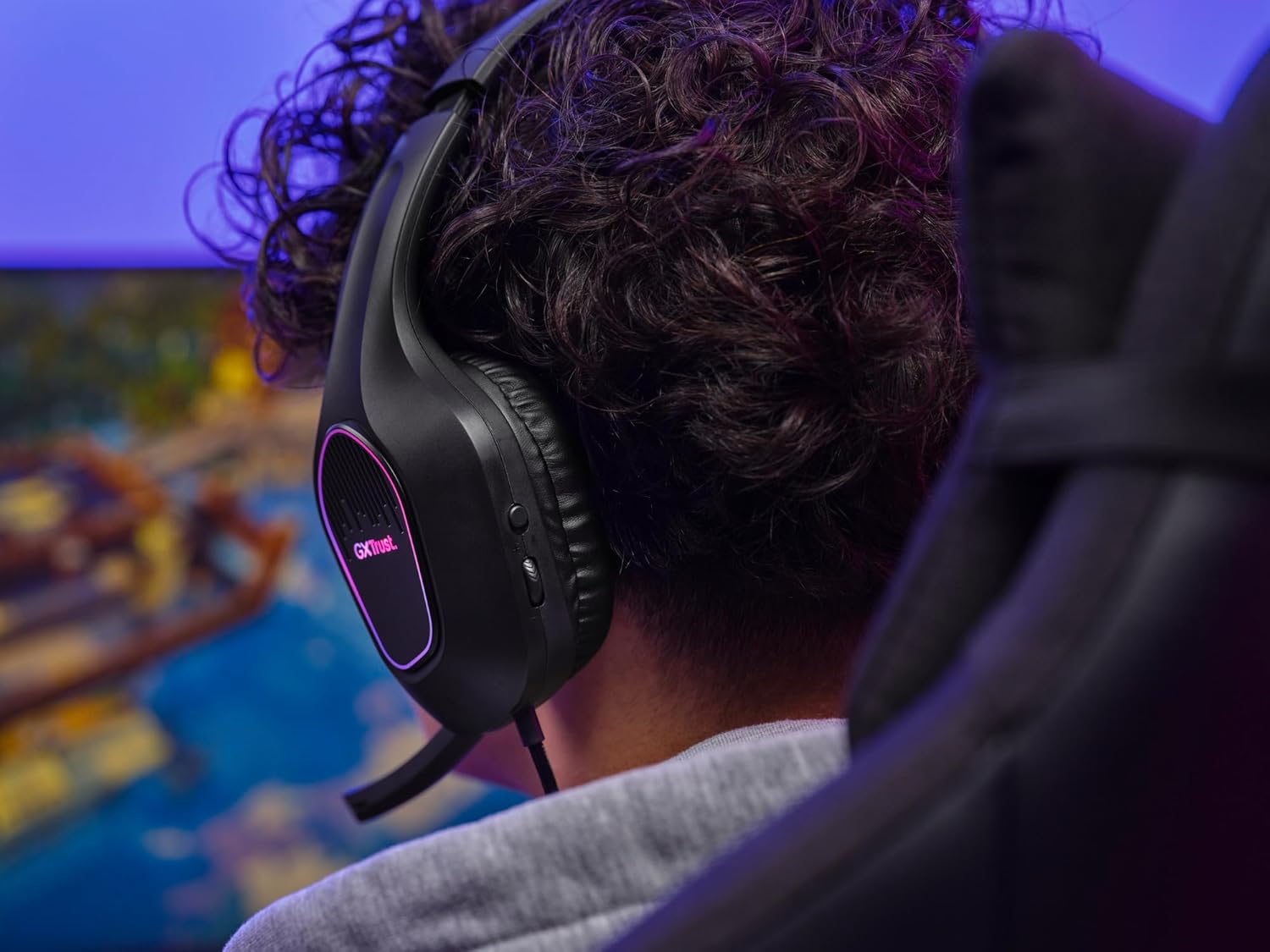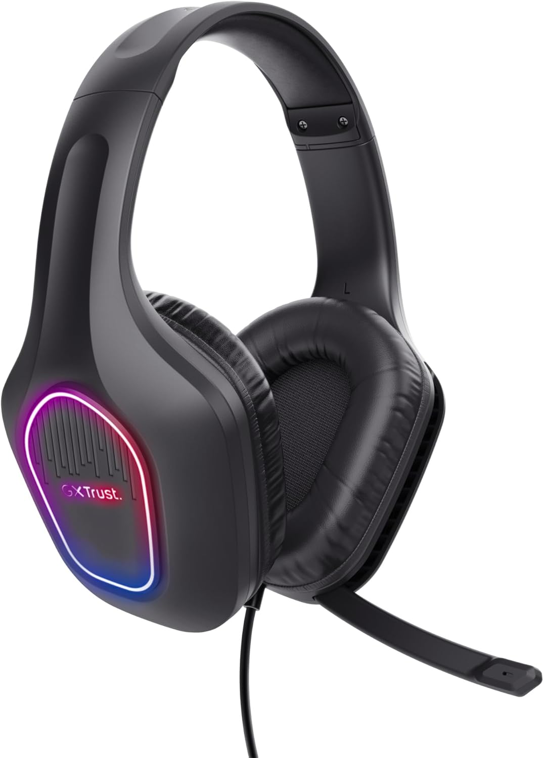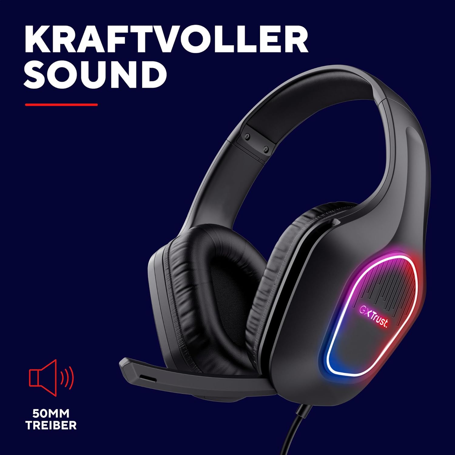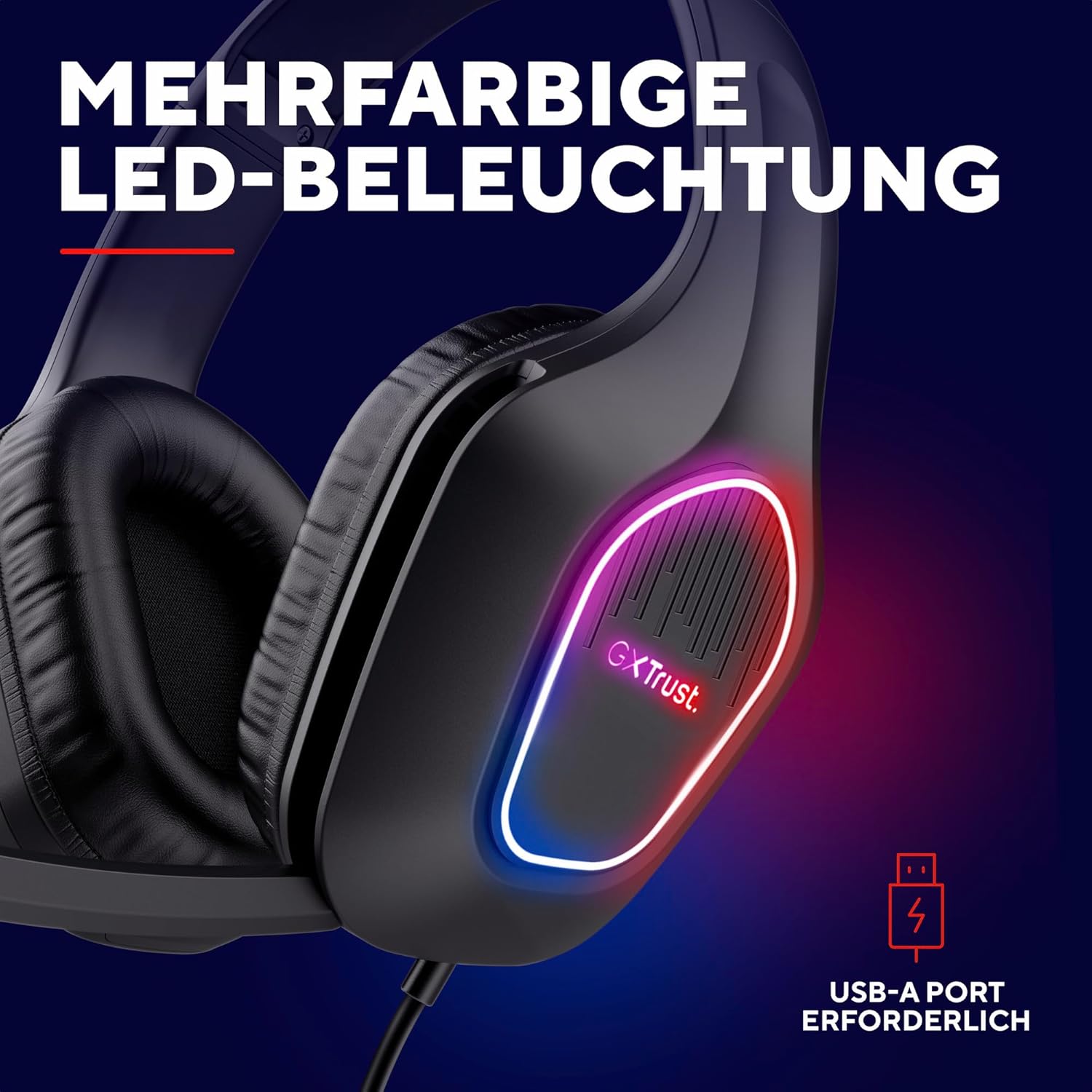 Trust Gaming GXT 419 Rayne леки геймърски слушалки за компютър/конзола, захранвани от USB LED осветление, 50 мм драйвери, 3.5 мм аудио жак, слушалки с кабел за компютър и лаптоп, черни