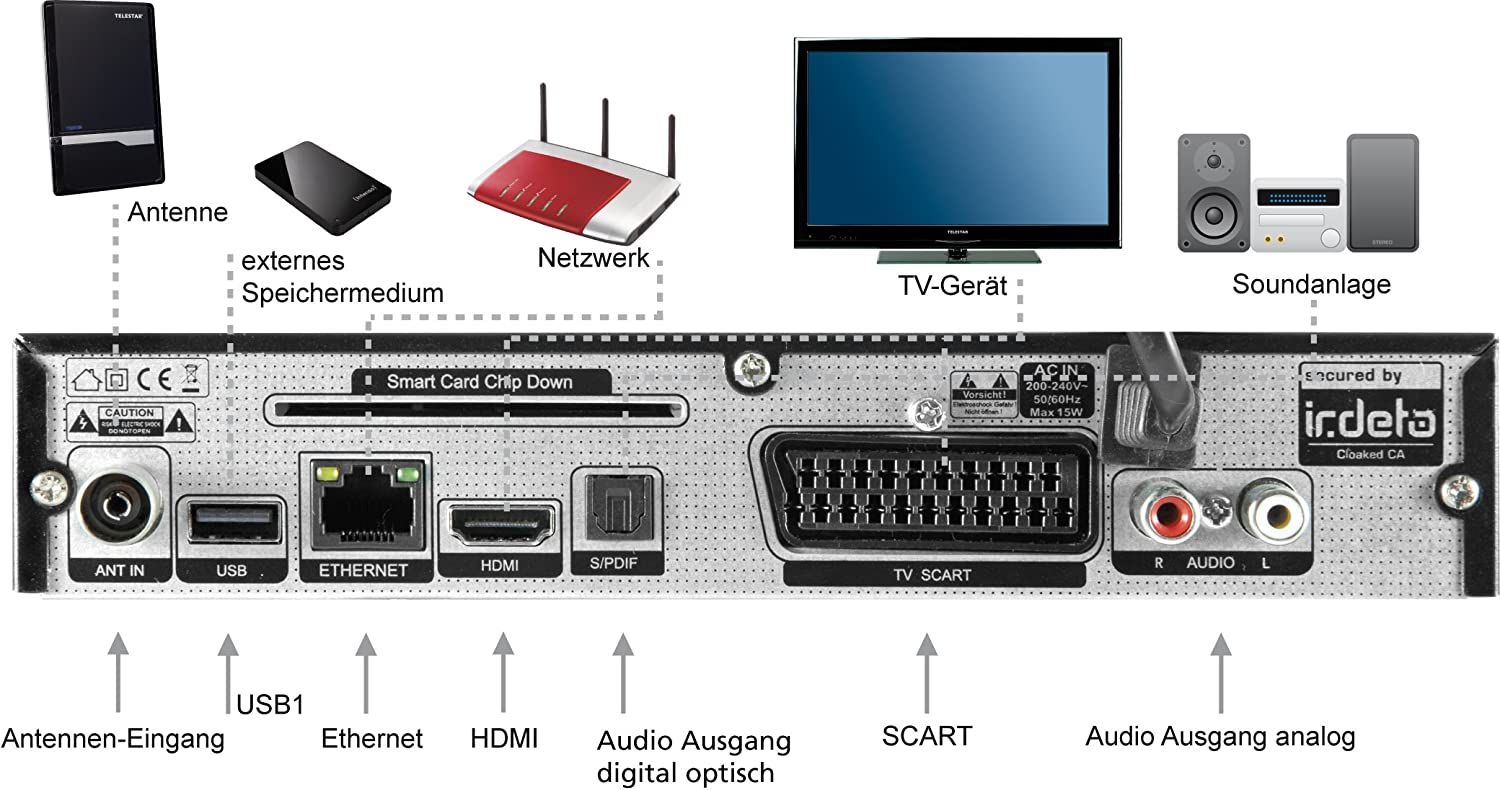 • DVB-T2 HD/DVB-C приемник с Irdeto декриптиране Freenet TV за частни станции, включително 3 месеца безплатен достъп (H.265/HEVC стандарт)