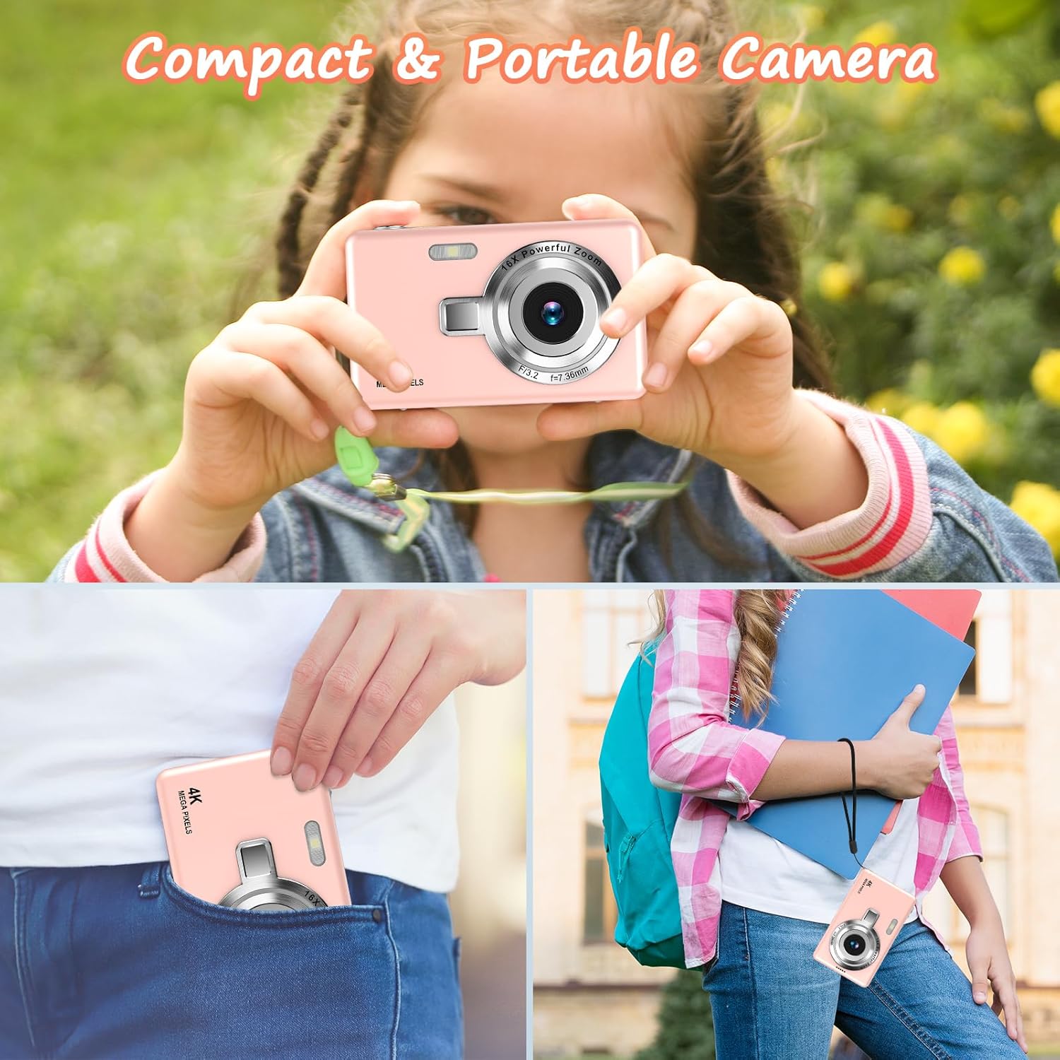 Цифров фотоапарат 1080P FHD компактен фотоапарат 44MP камера с 2.4-инчов LCD екран 16X цифрово увеличение лесен за влогване преносим цифров фотоапарат с 32GB SD карта за деца, тийнейджъри, ученици и начинаещи (розов)