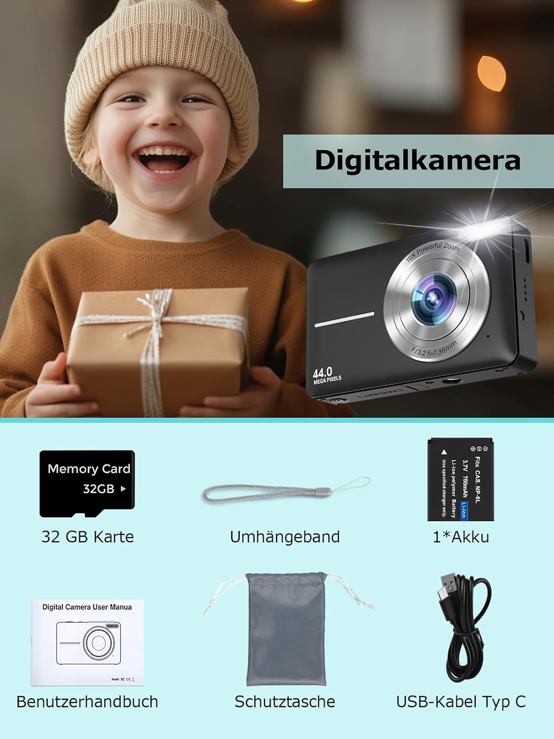 • Разопаковайте и започнете веднага - Перфектен подарък за начинаещи фотографи с фотоапарата: всичко необходимо, за да започнете веднага! Този лесен за употреба цифров фотоапарат се предлага с 32GB карта, 2 батерии, USB кабел и каишка. Опакован в цветна кутия, готова за подарък - идеален за подаръци за рожден ден, празници или изненади. Лесното управление и краткото ръководство за употреба позволяват на децата без усилие да запечатват креативни спомени.