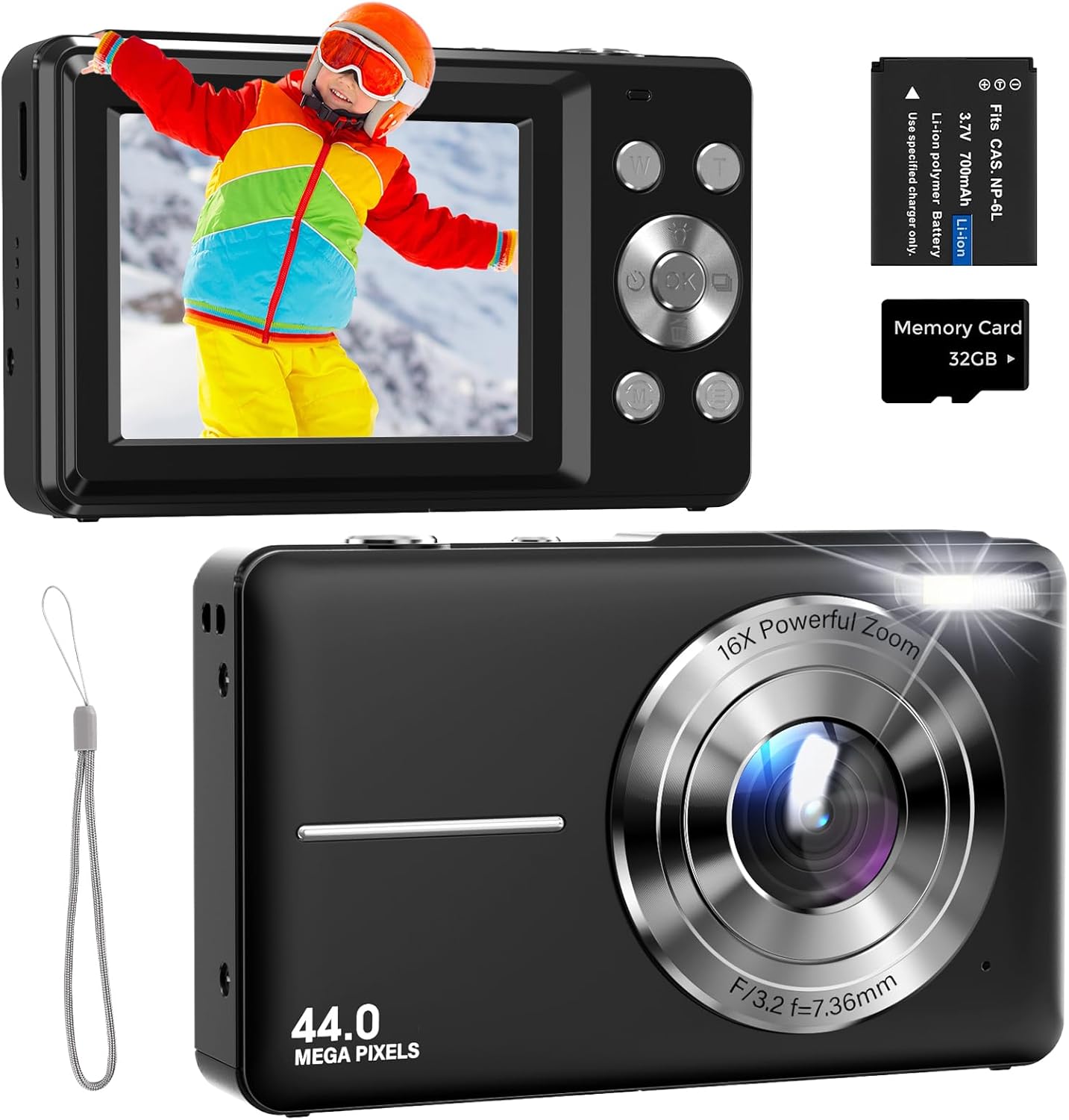 Цифров фотоапарат 44MP 1080P FHD компактен цифров фотоапарат с 16X цифрово увеличение 2.4-инчов компактен фото фотоапарат с 32GB карта, една батерия за тийнейджъри, деца и начинаещи, черен