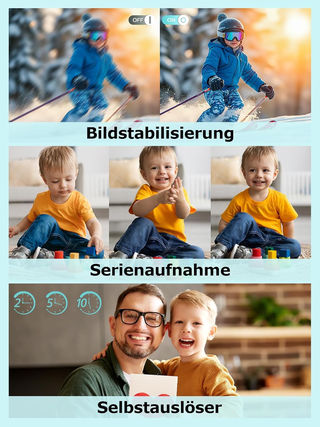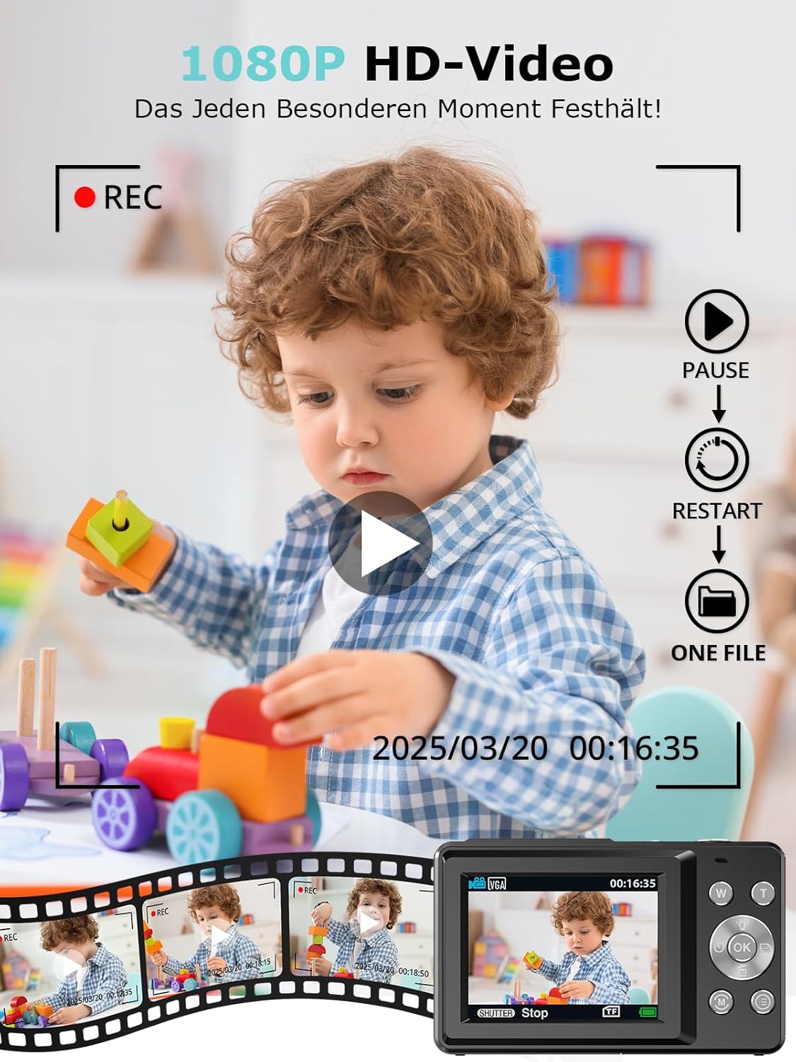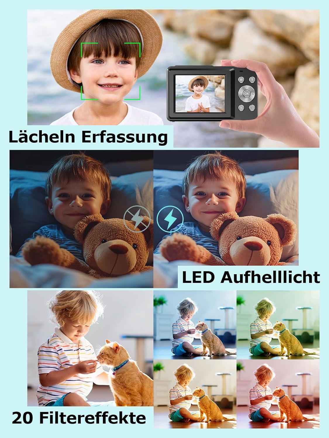 • Многофункционален цифров фотоапарат за деца, тийнейджъри и начинаещи: Този цифров фотоапарат съчетава 16-кратно увеличение, вградена светкавица и 20 креативни филтъра за подобряване на снимките. 2,4-инчовият IPS екран осигурява ярки визуализации, селфита с ограничено време (2/5/10 секунди) и съвместимостта с уеб камера стимулират игривото учене. Технологията против трептене и разпознаването на лице/усмивка осигуряват резки и фокусирани снимки. Универсален фото фотоапарат за пътуване, влогване или креативни проекти.