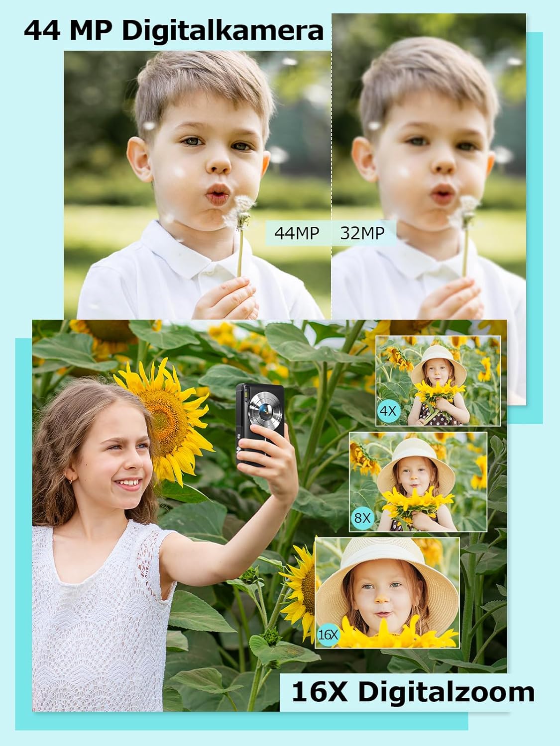 • Заснемайте ясни 44MP снимки и 1080P HD видеоклипове с цифровия фотоапарат: Проектиран за деца, тийнейджъри и начинаещи във фотографията, този компактен фотоапарат предлага впечатляваща 44-мегапикселова резолюция и плавен 1080P запис. Идеален за семейни излети, училищни проекти или творчески открития, със стабилизатор на изображението и разпознаване на лице/усмивка за професионални резултати.