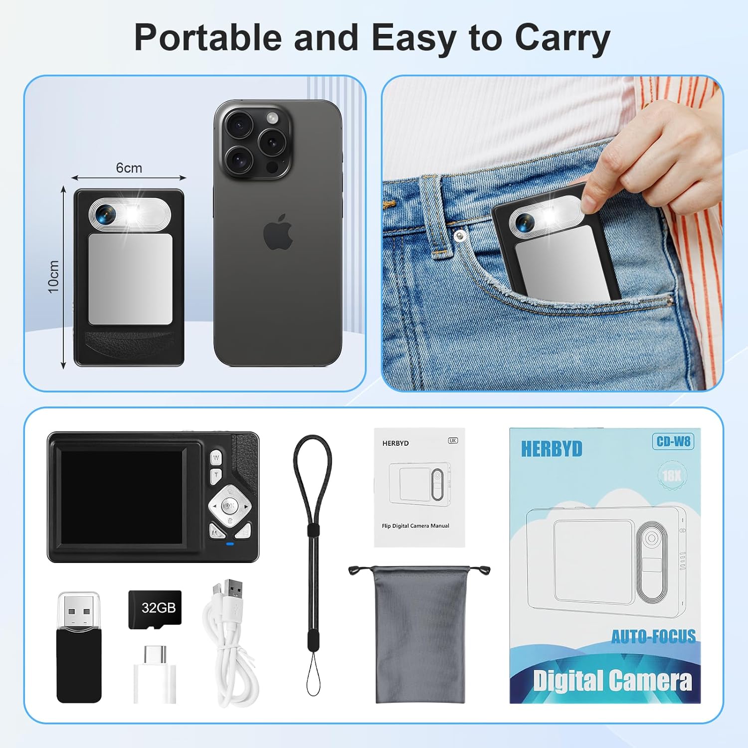 • Преносим и практичен: пакетът включва цифров фотоапарат, 32GB карта памет, четец на карти, ръководство за потребителя, USB кабел за зареждане, адаптер, чанта за съхранение и връзка за носене. Можете да използвате цифровия фотоапарат, за да правите снимки и влогове на рождени дни, пикници, концерти, абитуриентски балове и пътувания. Това е чудесен фотоапарат за деца, студенти, възрастни, пенсионери и начинаещи, идеален като подарък за Коледа, рожден ден или празник.