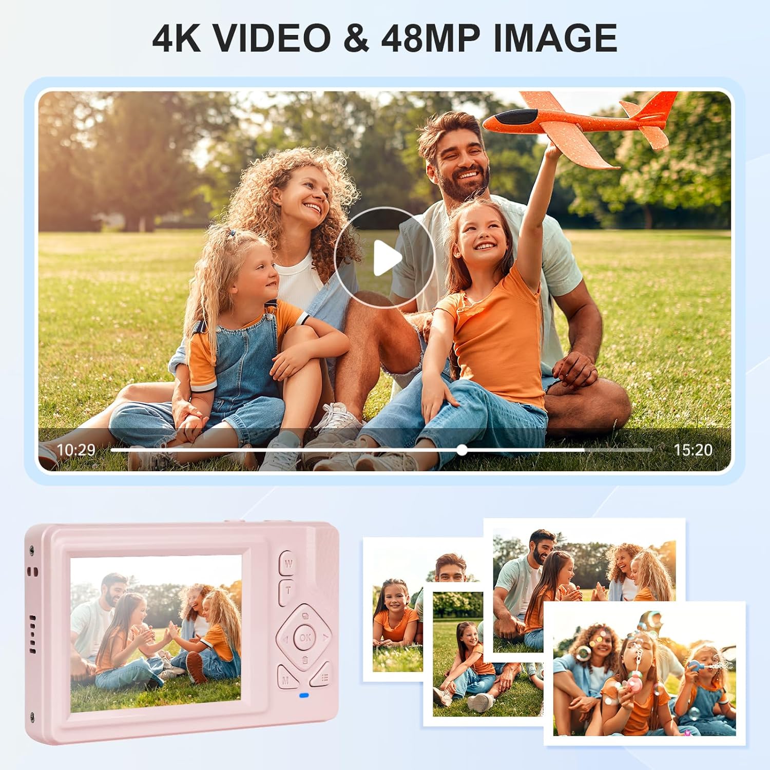 Цифров фотоапарат 4K - 48MP UHD компактен цифров фотоапарат с 2.8-инчов LCD екран и 18x цифрово увеличение, Anti-Shake фотография, влог камера с 32GB SD карта за деца, ученици, начинаещи, тийнейджъри (розов)