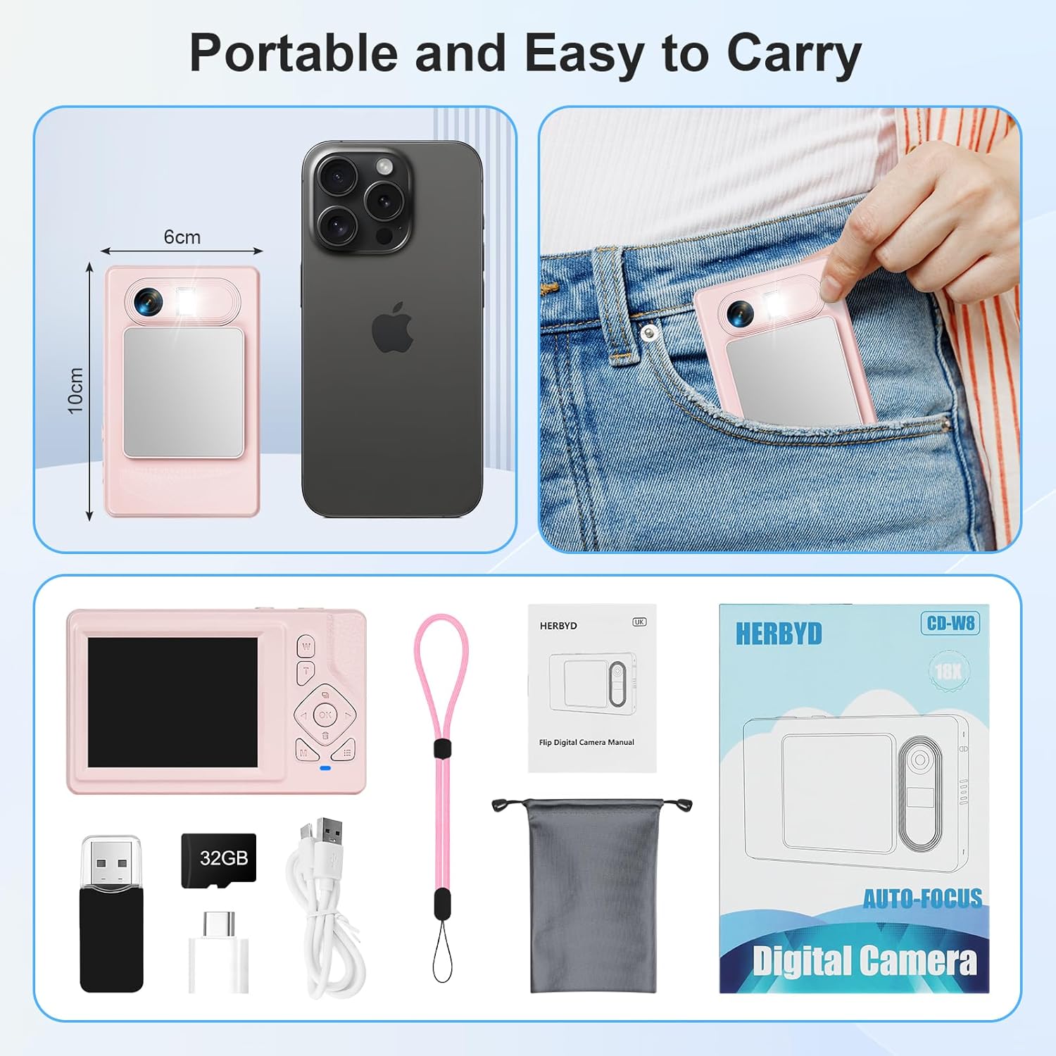 • Преносим и практичен: пакетът включва цифров фотоапарат, 32GB карта памет, четец на карти, ръководство за потребителя, USB кабел за зареждане, адаптер, чанта за съхранение и връзка за носене. Можете да използвате цифровия фотоапарат, за да правите снимки и влогове на рождени дни, пикници, концерти, абитуриентски балове и пътувания. Това е чудесен фотоапарат за деца, студенти, възрастни, пенсионери и начинаещи, идеален като подарък за Коледа, рожден ден или празник.