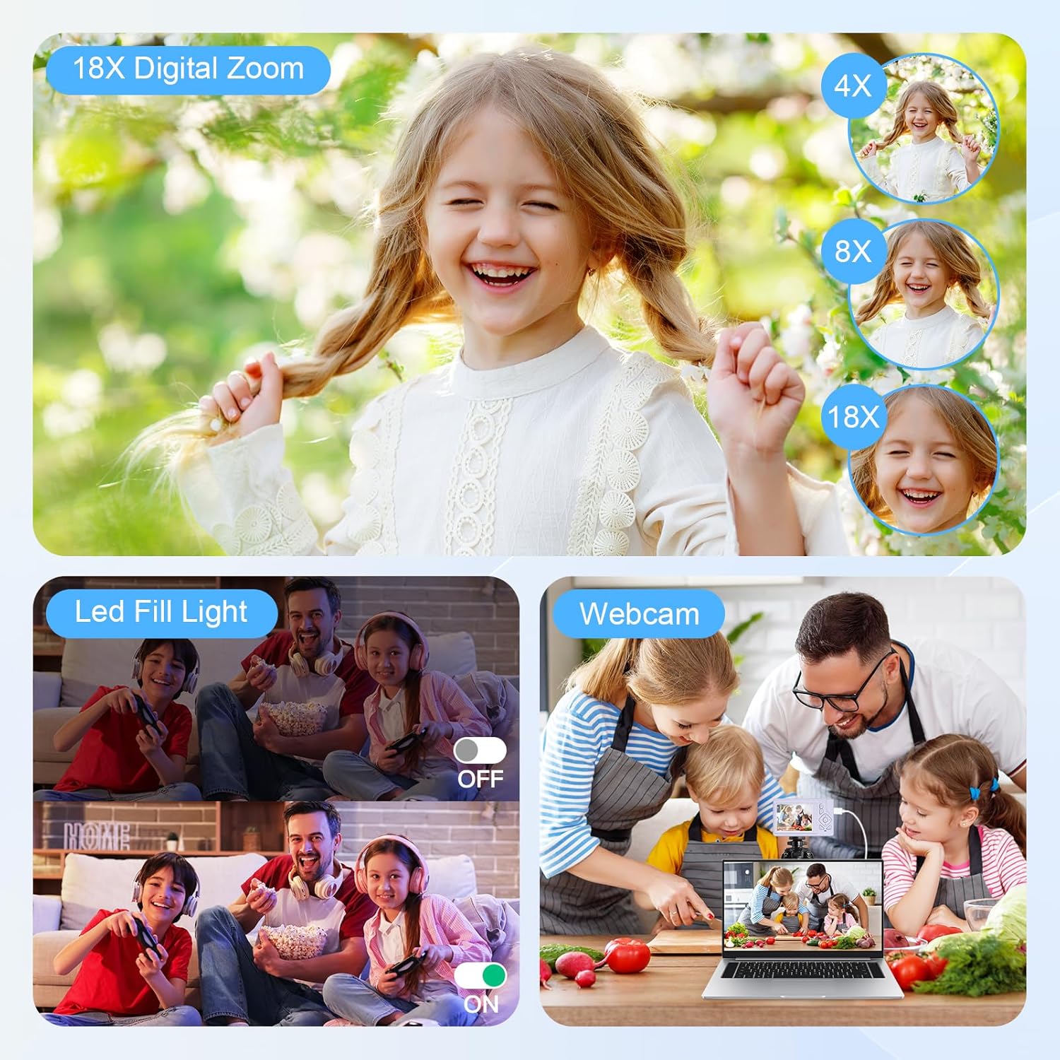 • 18x цифрово увеличение: Този цифров фотоапарат „насочи и снимай“ има подобрена функция за автоматично фокусиране, за да гарантира, че направените снимки вече не са размазани или замъглени, така че да не пропуснете нито един завладяващ момент. Мощното 18x цифрово увеличение ви позволява да правите ясни изображения дори от разстояние, носейки ви уникално фотографско изживяване.