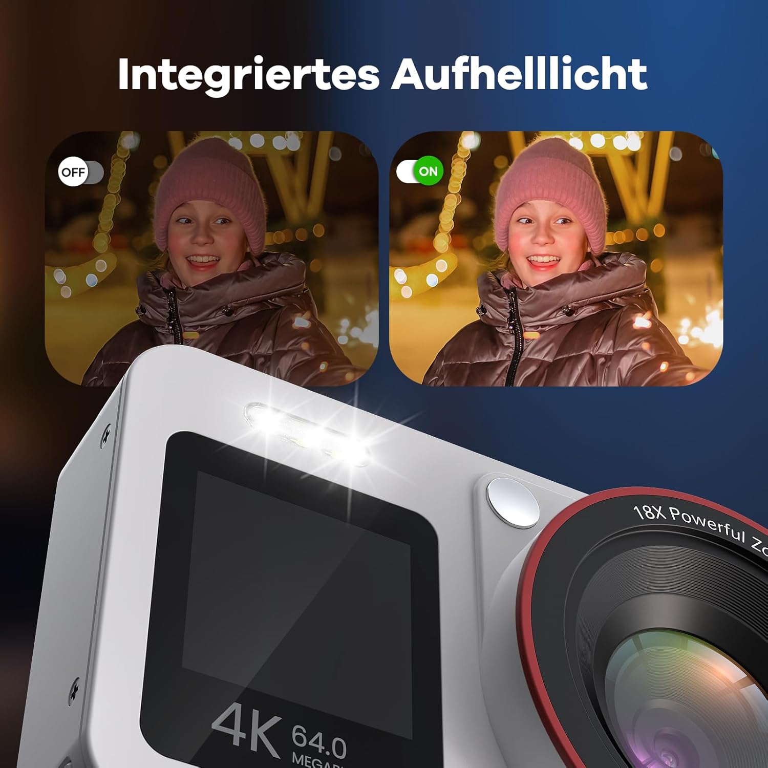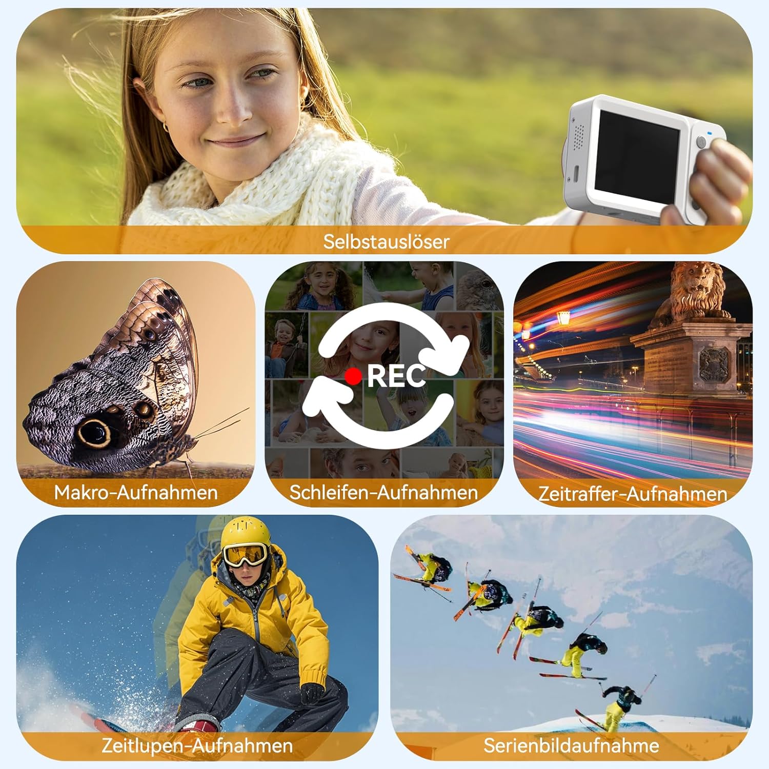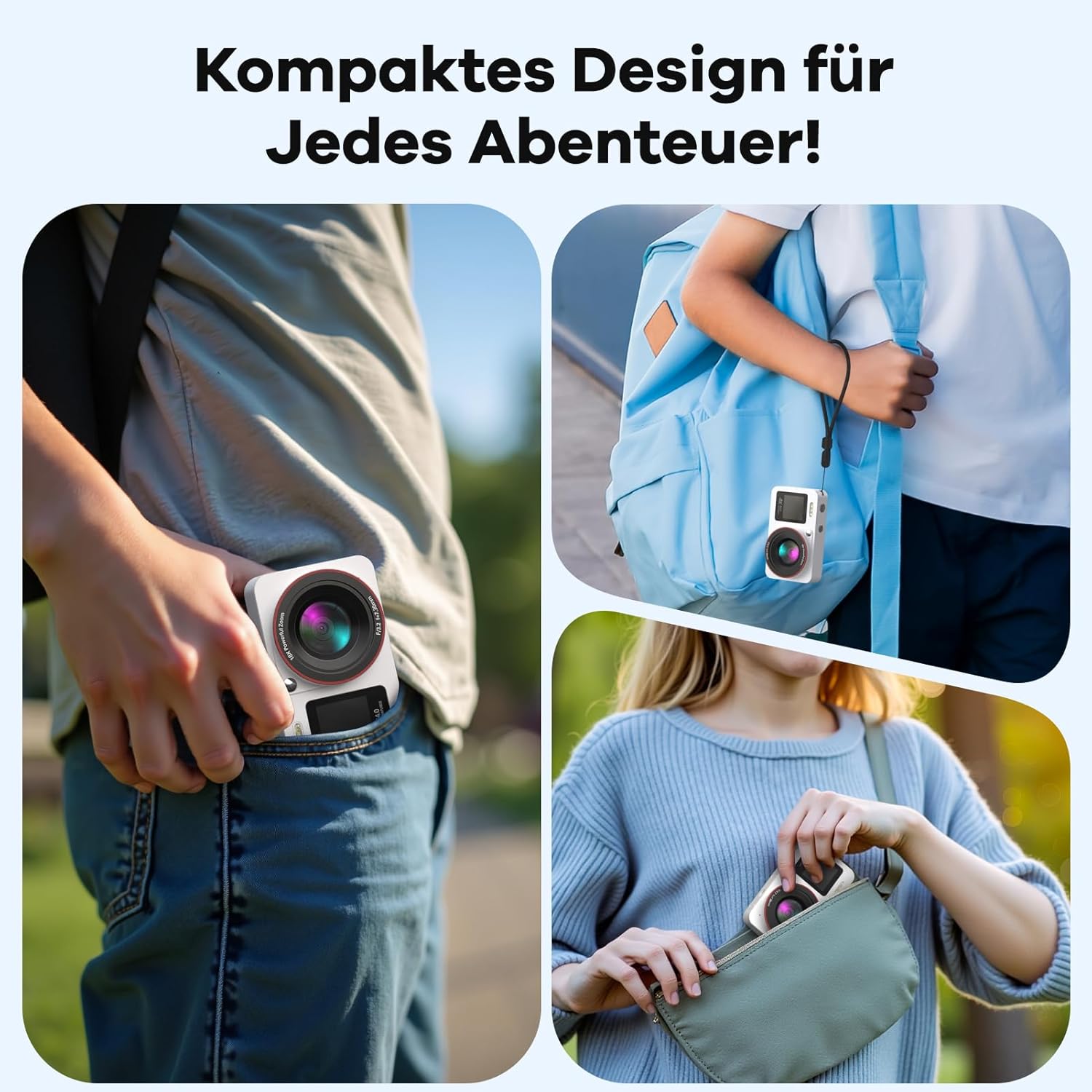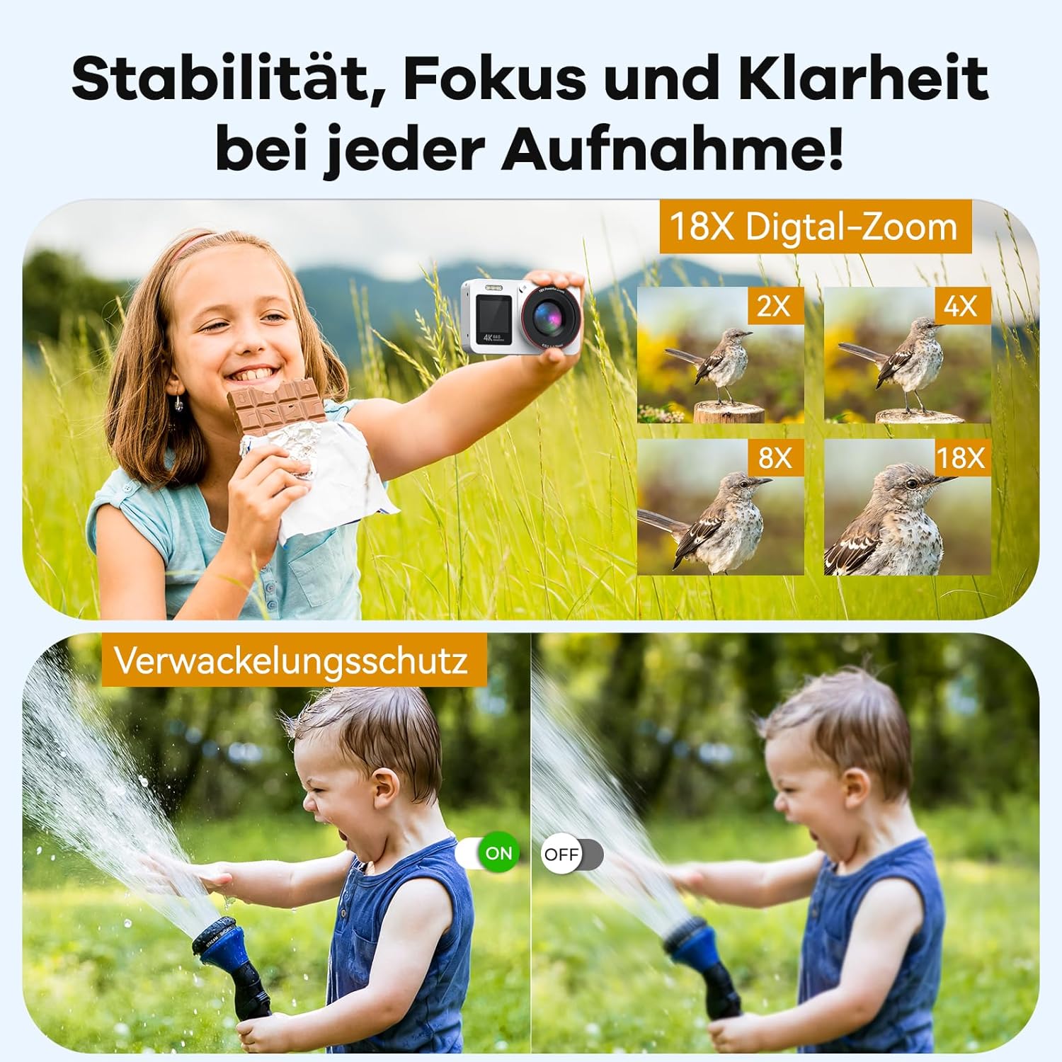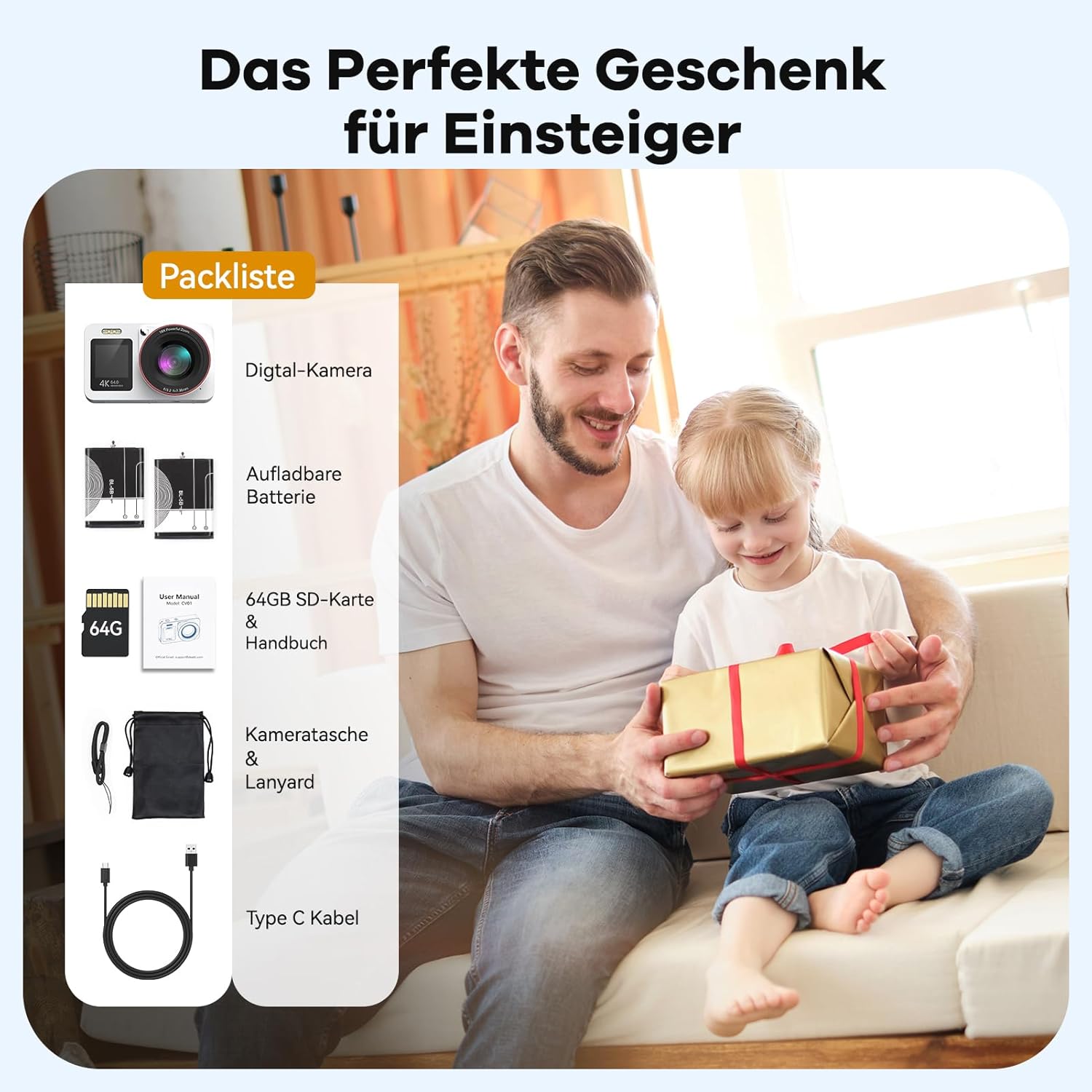 • Преносим дизайн и дълъг живот на батерията: лекият и компактен корпус на този цифров фотоапарат е идеален за пътуване и ежедневна употреба. С две акумулаторни батерии и карта памет с голям капацитет от 64 GB, не е нужно да се притеснявате за енергия или място за съхранение – така че можете да заснемете всяка специална сцена без прекъсване. Независимо дали става въпрос за близки планове или широкоъгълни моменти, този цифров фотоапарат ви позволява да се наслаждавате на максимална свобода и качество на записа.