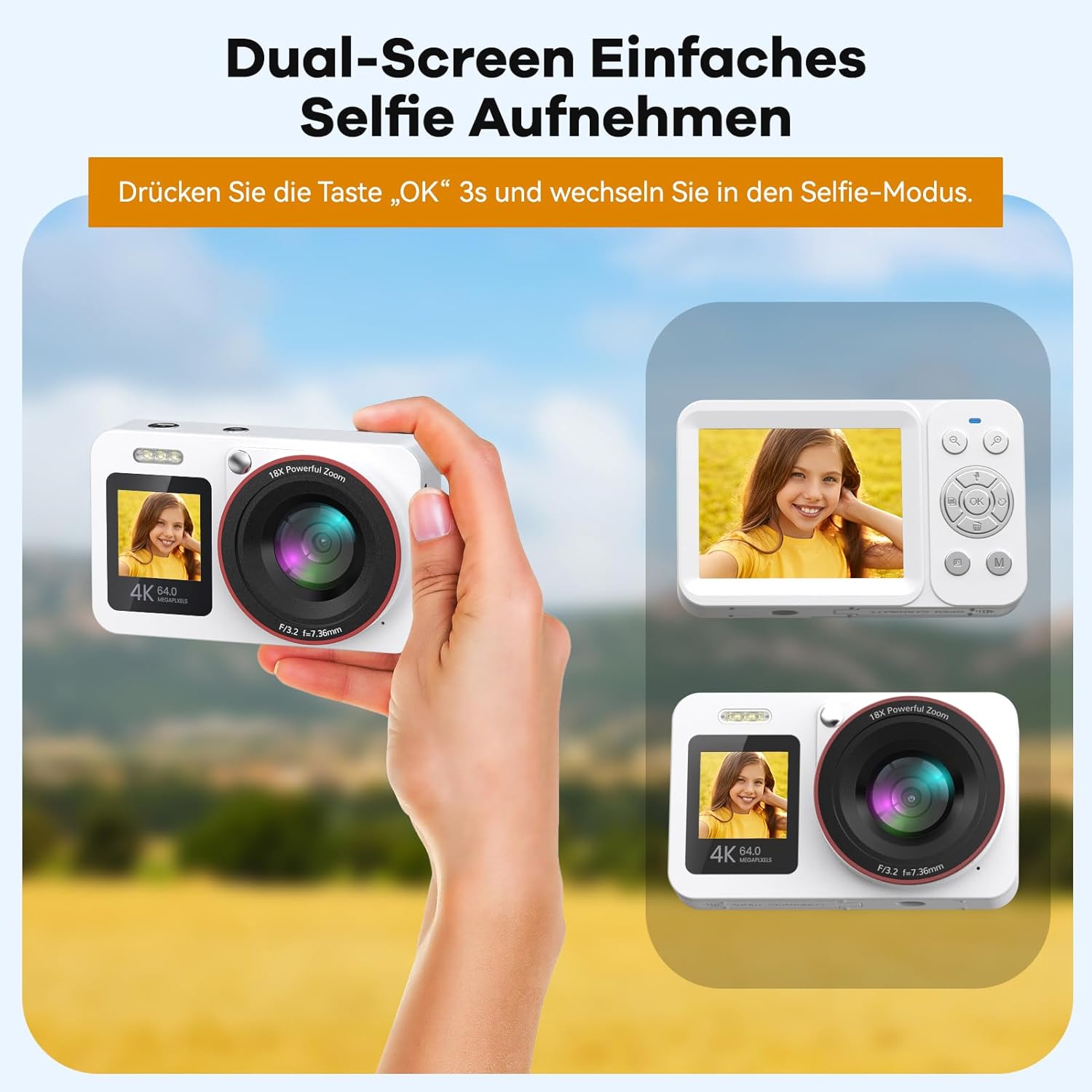 Цифров фотоапарат 4K 64MP FHD фотокамера за деца, фотоапарат с 18X цифрово увеличение, компактен фотоапарат с 2 екрана, 64GB SD карта за деца, тийнейджъри, начинаещи, бял
