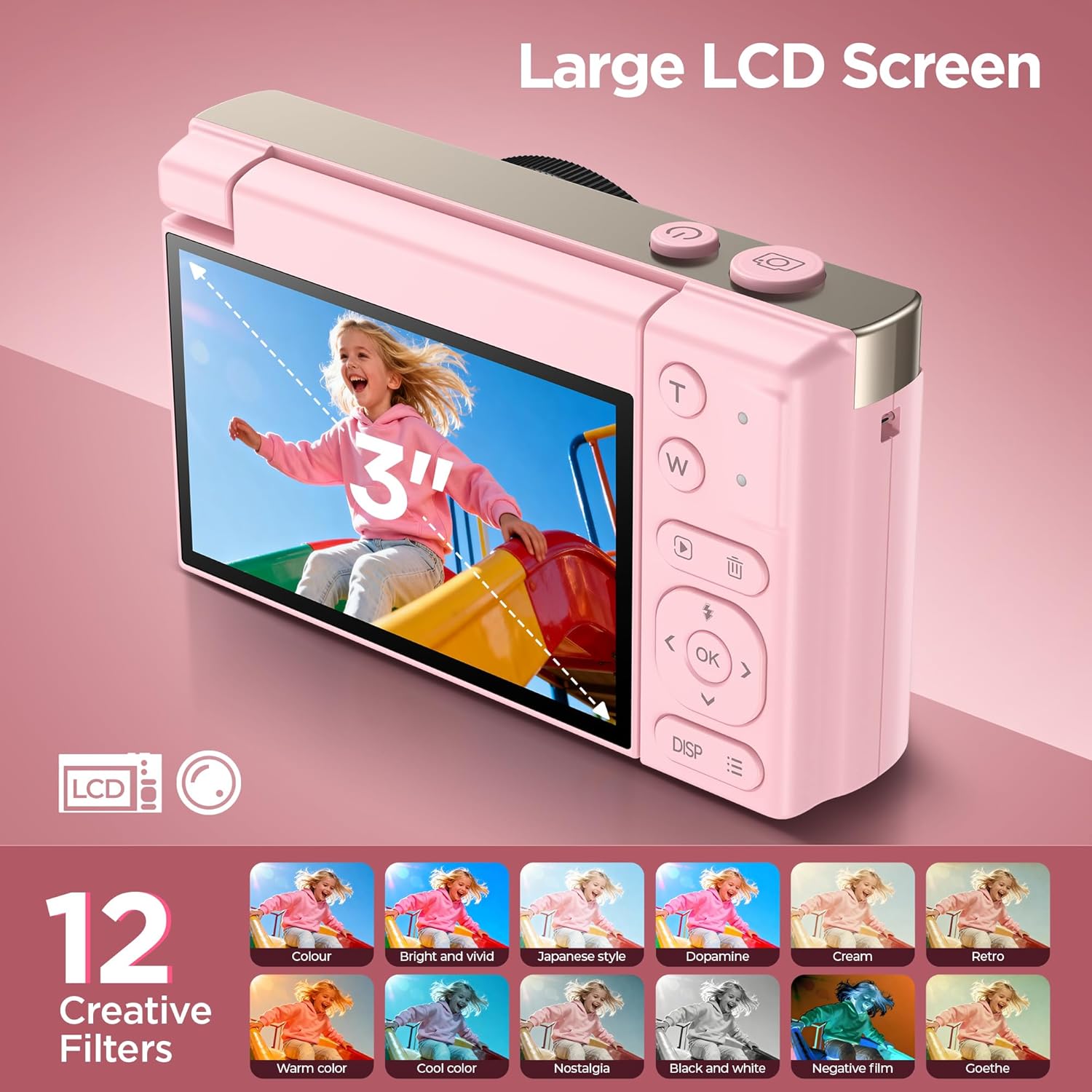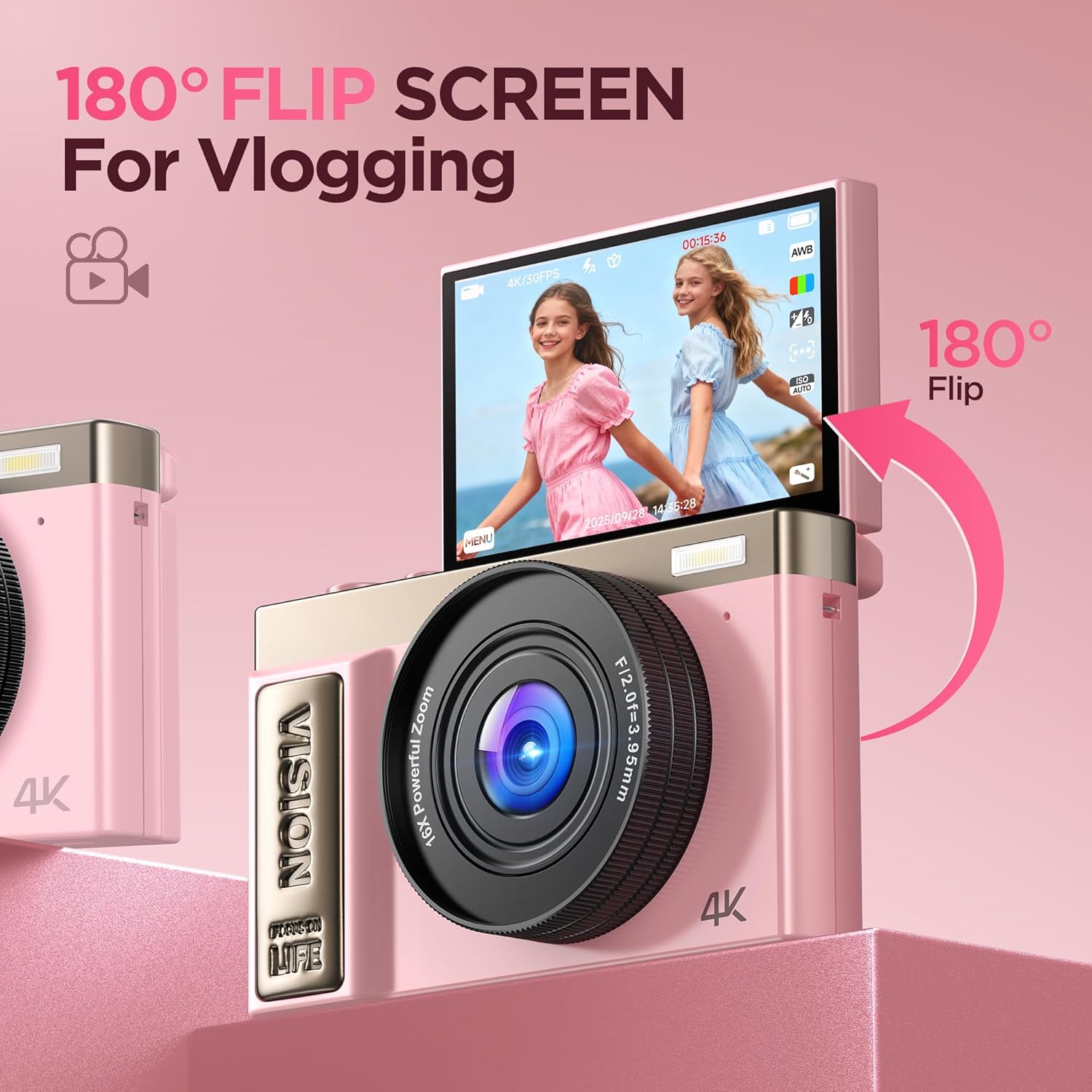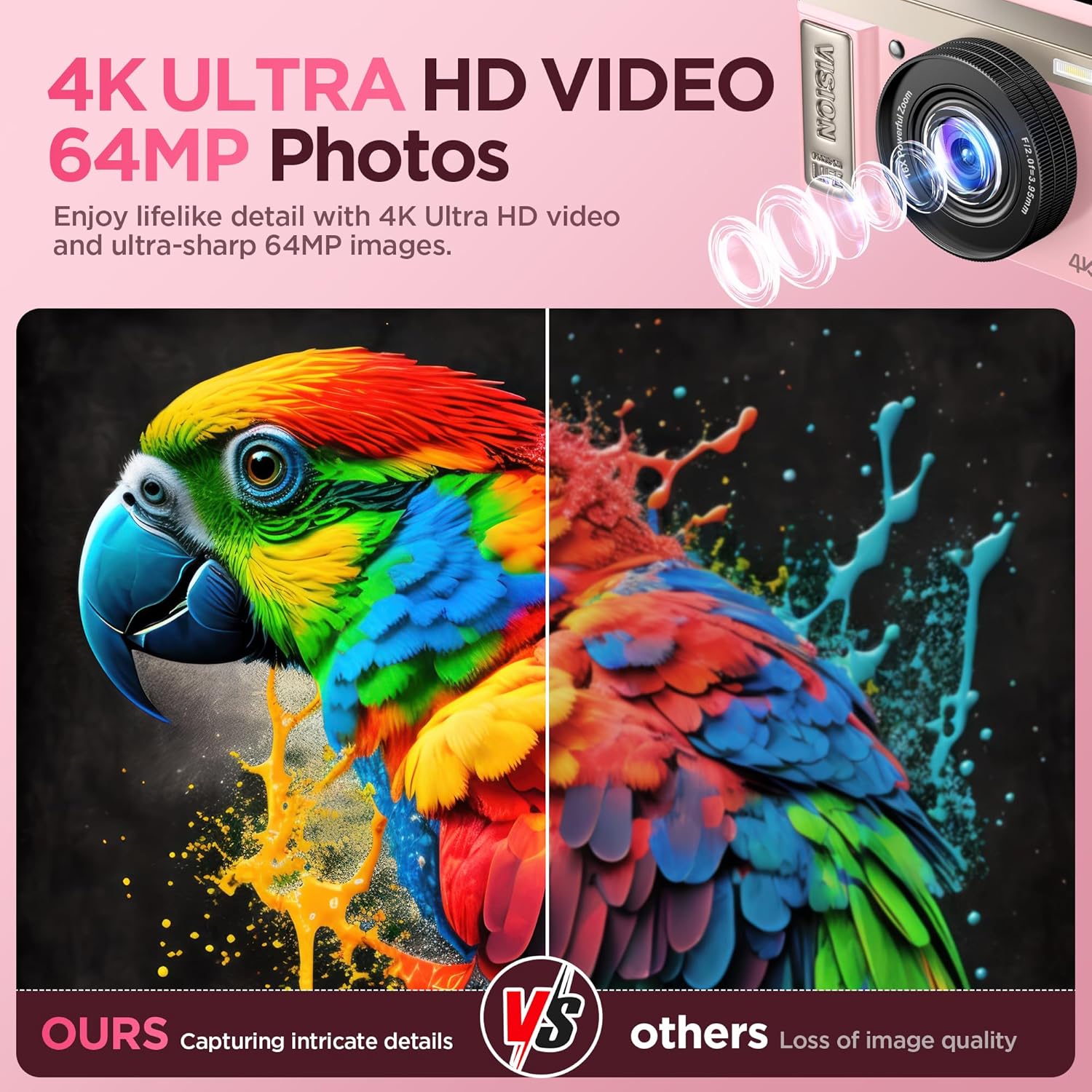 Цифров фотоапарат 4K 64MP Фотоапарат: Розов цифров фотоапарат за влог - Цифров фотоапарат с автофокус - Винтидж фотокамера за деца - Подаръци за тийнейджъри, момчета, момичета 10-18 години - Сгъваем екран на 180°