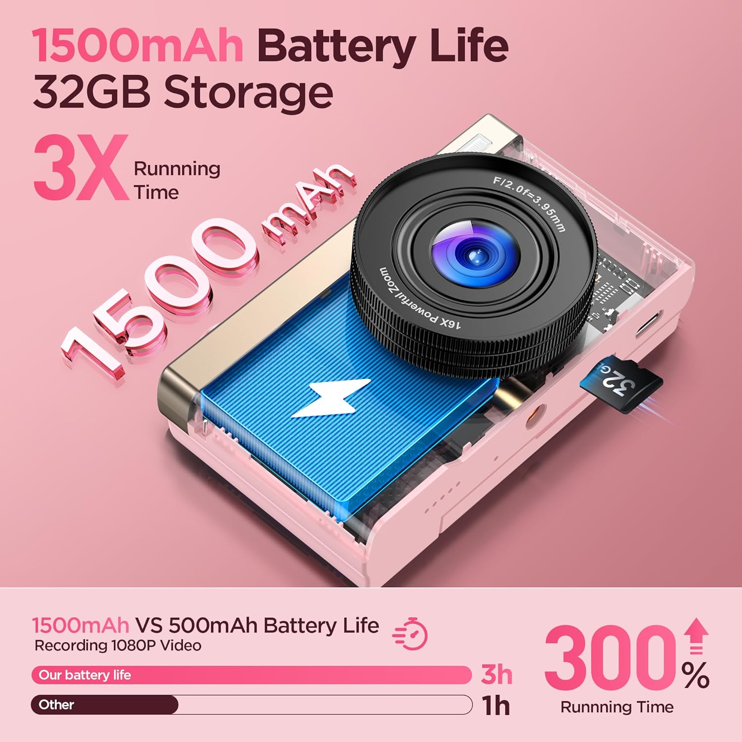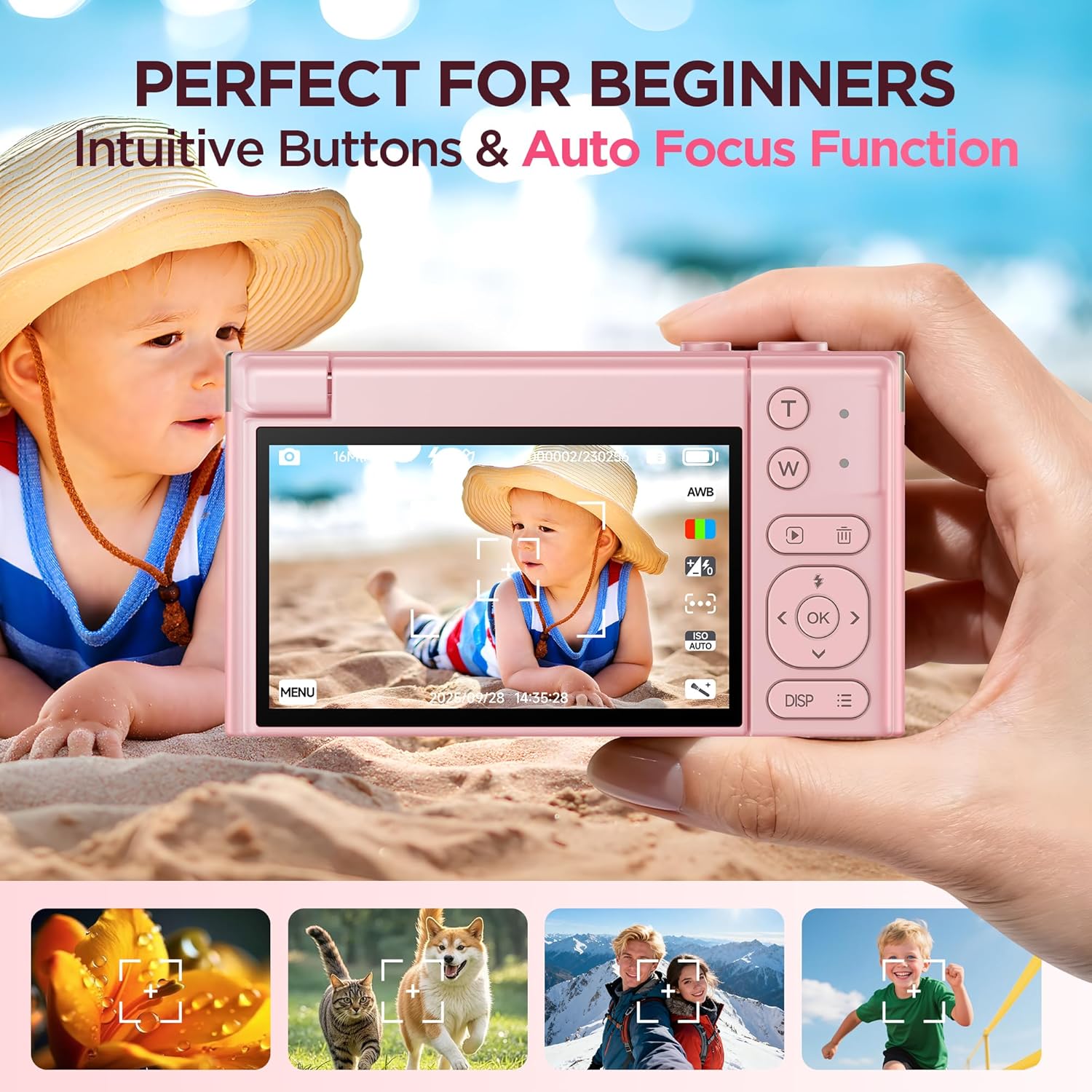 • 16-кратно цифрово увеличение и компактен дизайн на фотоапарата: С 16-кратно увеличение улавяте всеки детайл отблизо. Независимо дали става въпрос за снимка или видео, този мини компактен фотоапарат се побира във всеки джоб - практичен като джобен фотоапарат или фотоапарат за еднократна употреба, но с модерна HD технология. Идеален за пътуване, влогове, съдържание в Instagram или за креативни деца.
