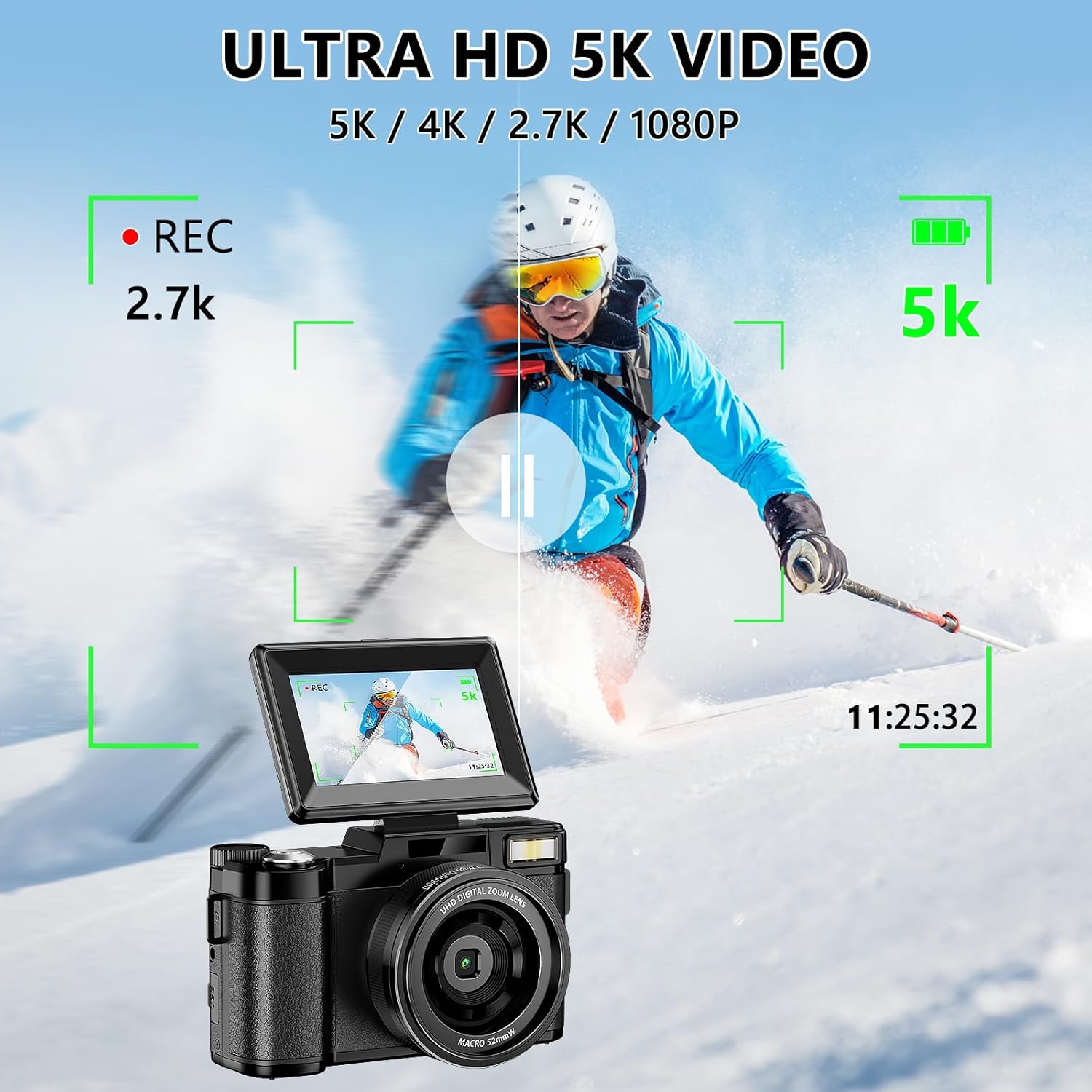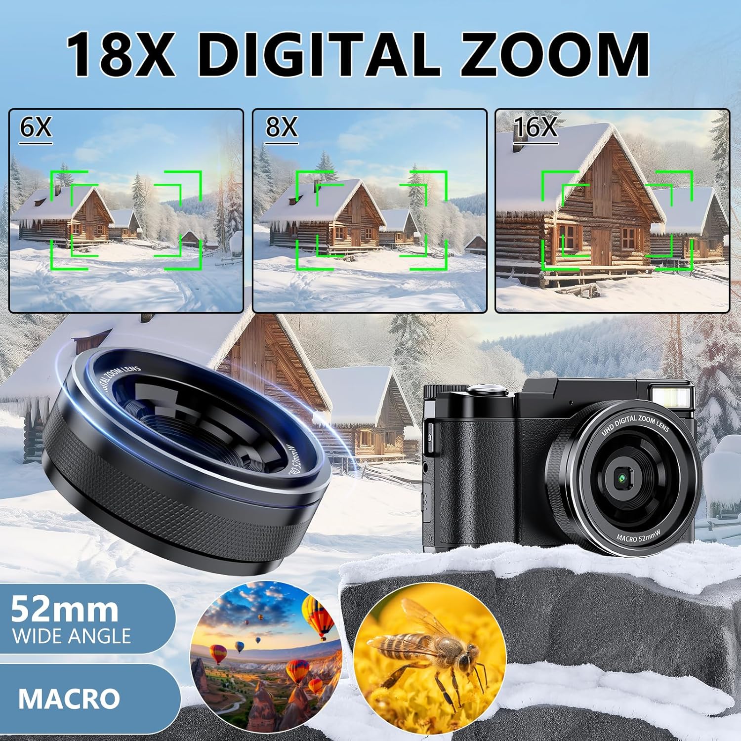 • 5K Ultra HD запис с 18x увеличение: Този цифров фотоапарат поддържа 5K Ultra HD видеозапис в комбинация с 18x увеличение. Той осигурява ясни детайли и плавни ефекти на движението – независимо дали се заснемат далечни пейзажи или бързо движещи се сцени. Идеален за фотография при пътуване, документиране на спортове на открито и изисквания за изображения с висока резолюция за професионални потребители.
