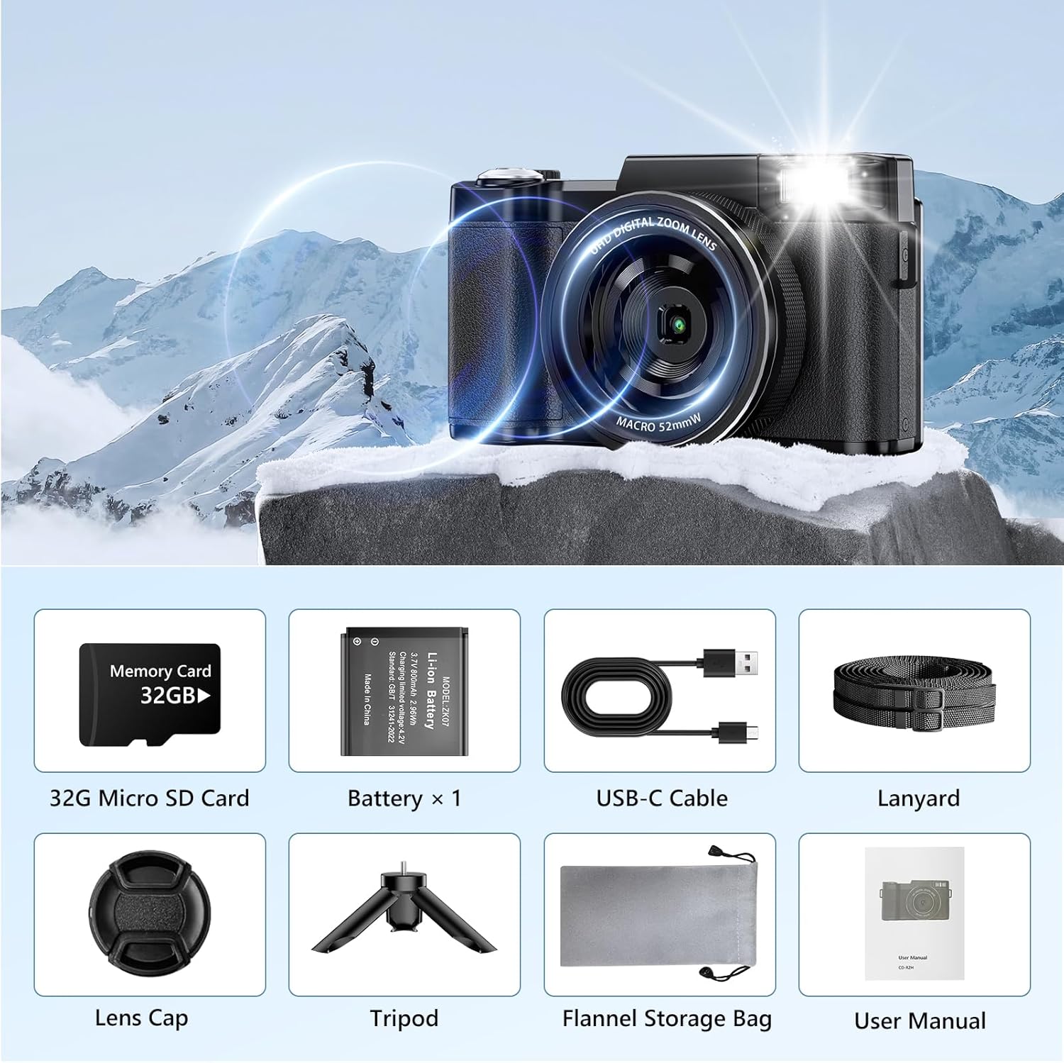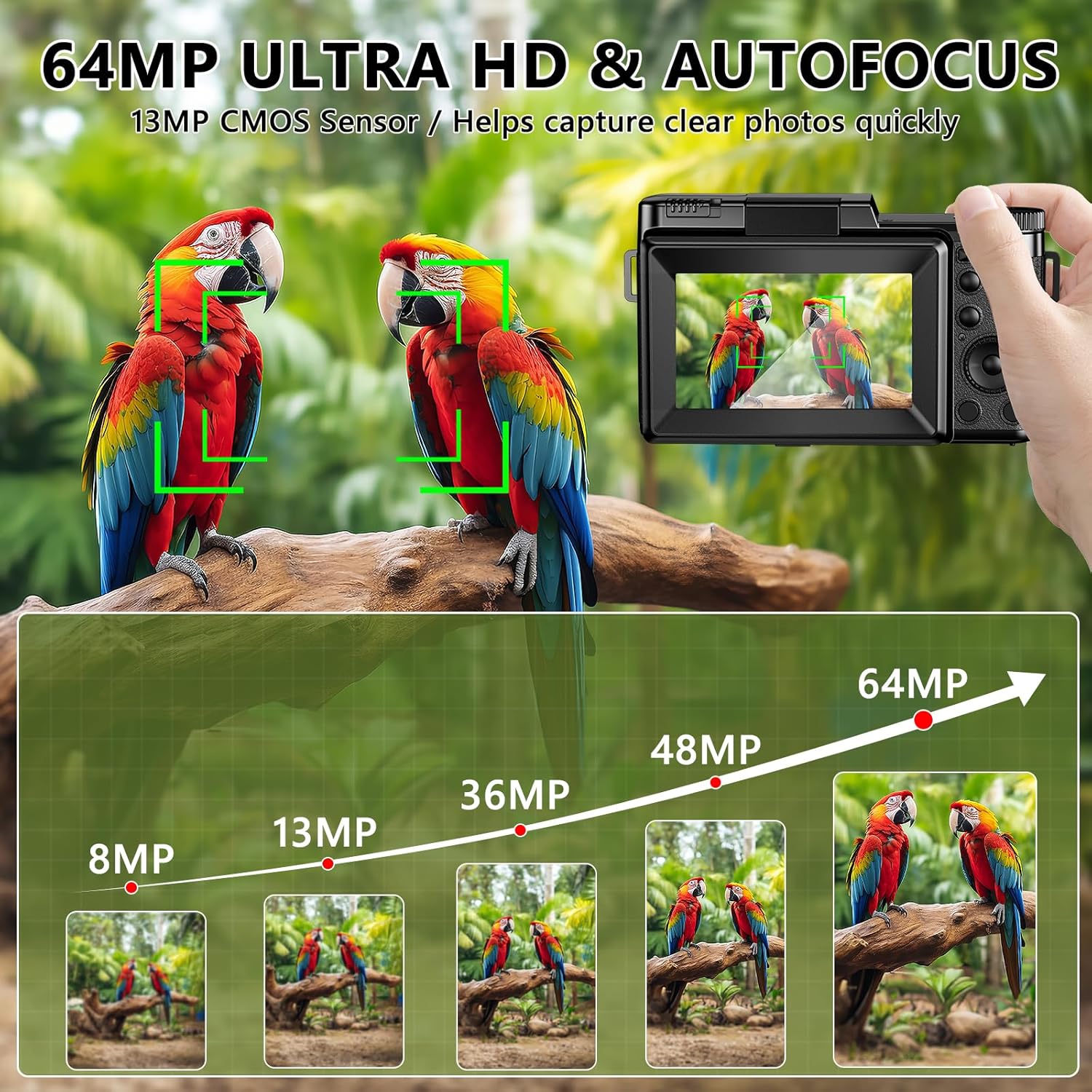 Цифров фотоапарат 5K 64MP камера с автофокус Компактен фотоапарат Детски фотоапарат Цифров фотоапарат Винтидж детски ретро фотокамера 180° сгъваем LCD екран HD компактна влог камера 3-инчов 32GB карта