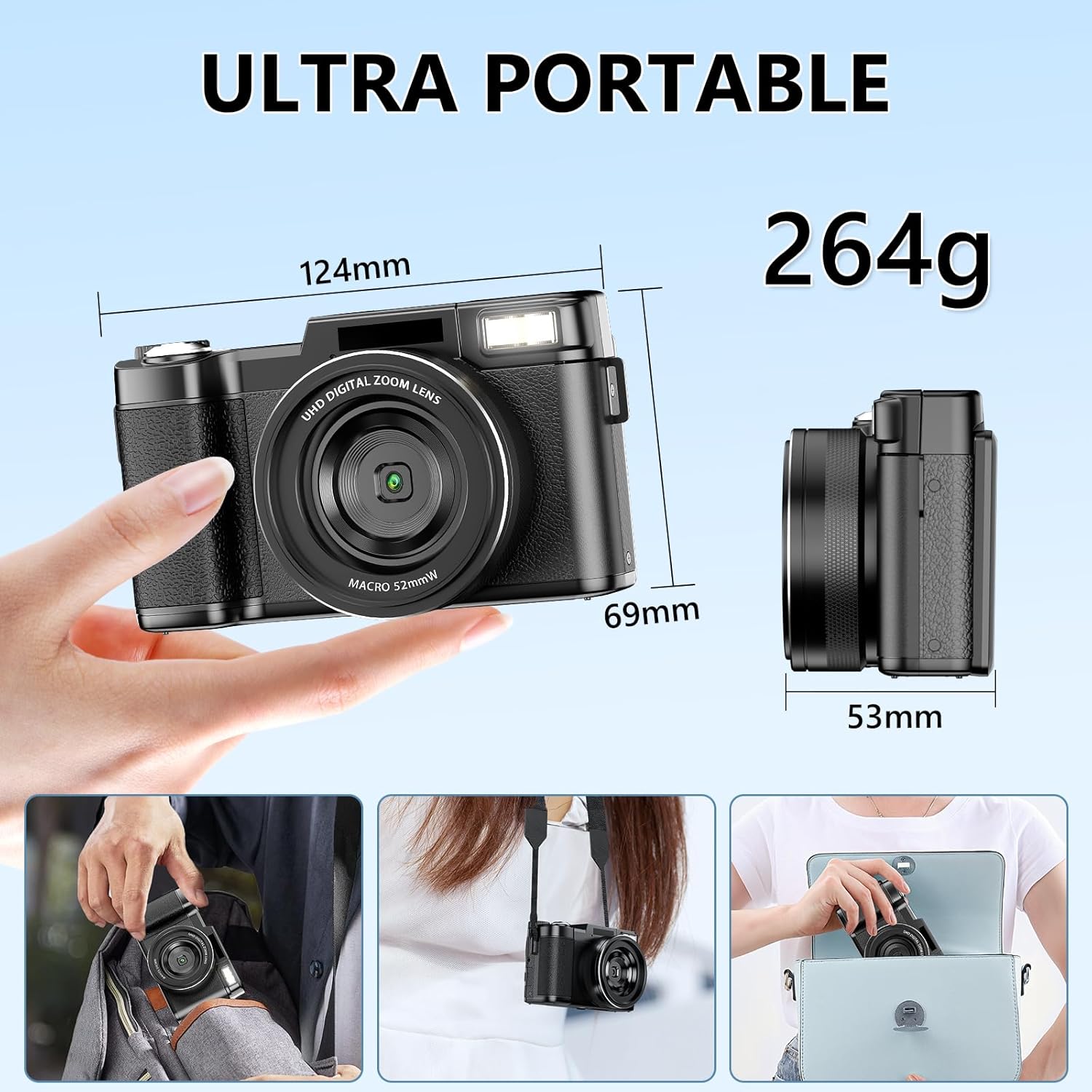 • Въртящ се на 180° дисплей + 3-инчов голям екран: оборудван с 3-инчов дисплей с функция за завъртане на 180° за гъвкави ъгли на снимане и преглед на селфита. Специално проектиран за ентусиасти на влогове, селфита и креативна фотография от нисък ъгъл.